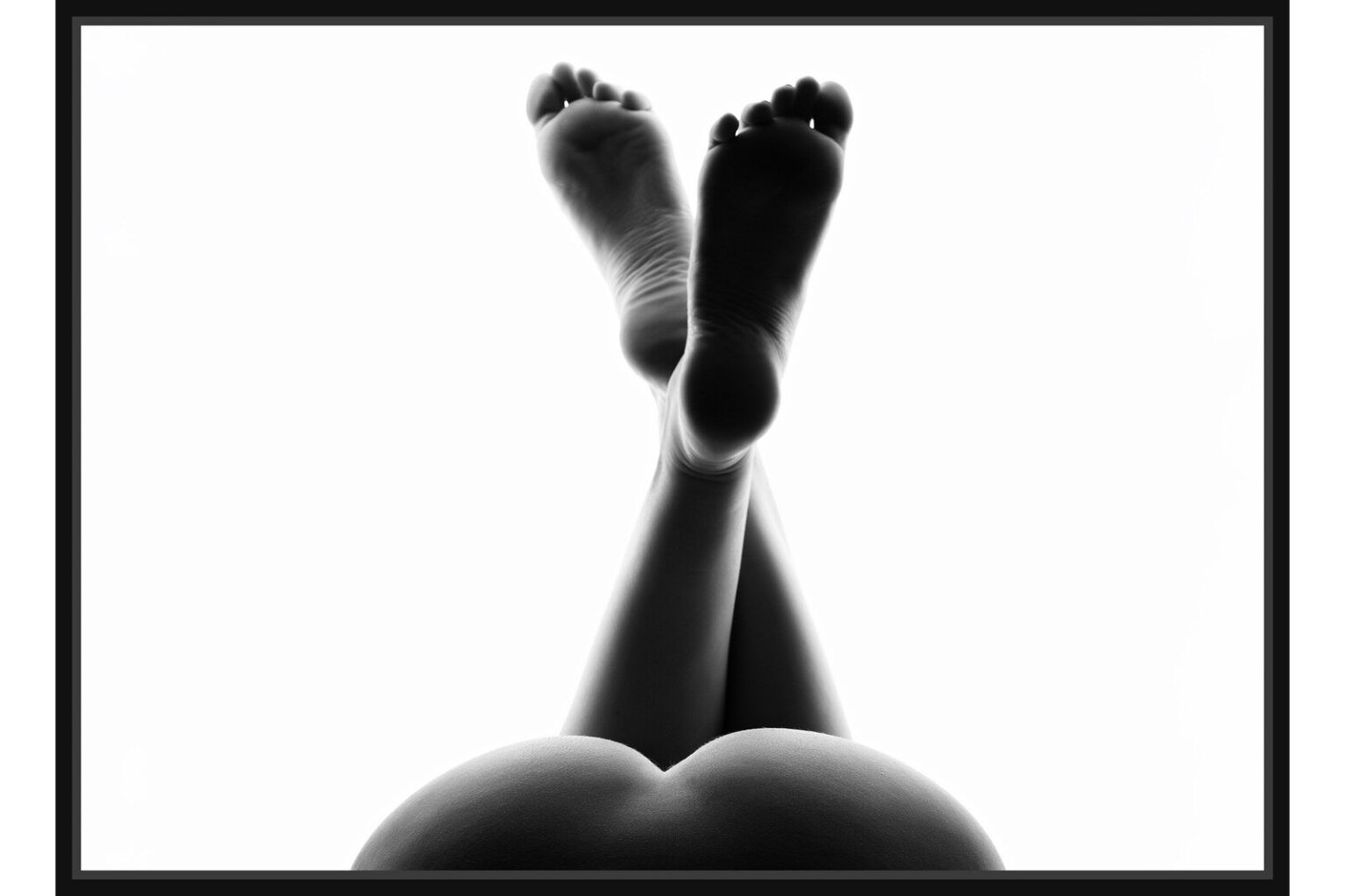 Художествена фотография в черно-бяло, показваща женски крака, кръстосани нагоре, с подчертани линии и контраст между светлината и сянката. Кадърът създава абстрактна, минималистична визия.