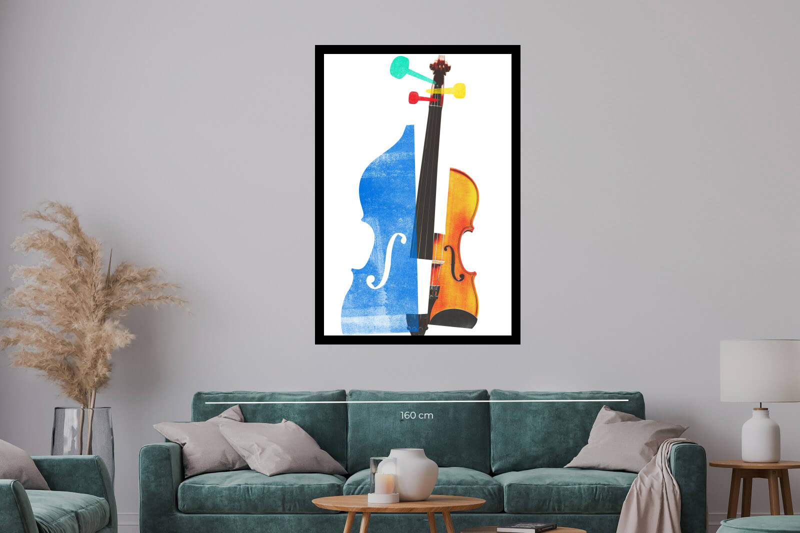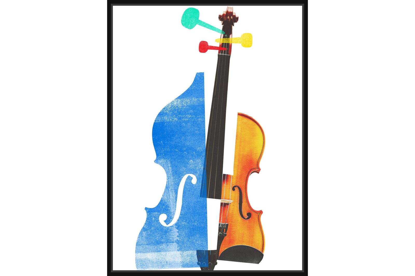Илюстрация, която комбинира цигулка с абстрактни цветни елементи в синьо, жълто, зелено и червено. Съчетава класическата елегантност на инструмента с модерно артистично излъчване.