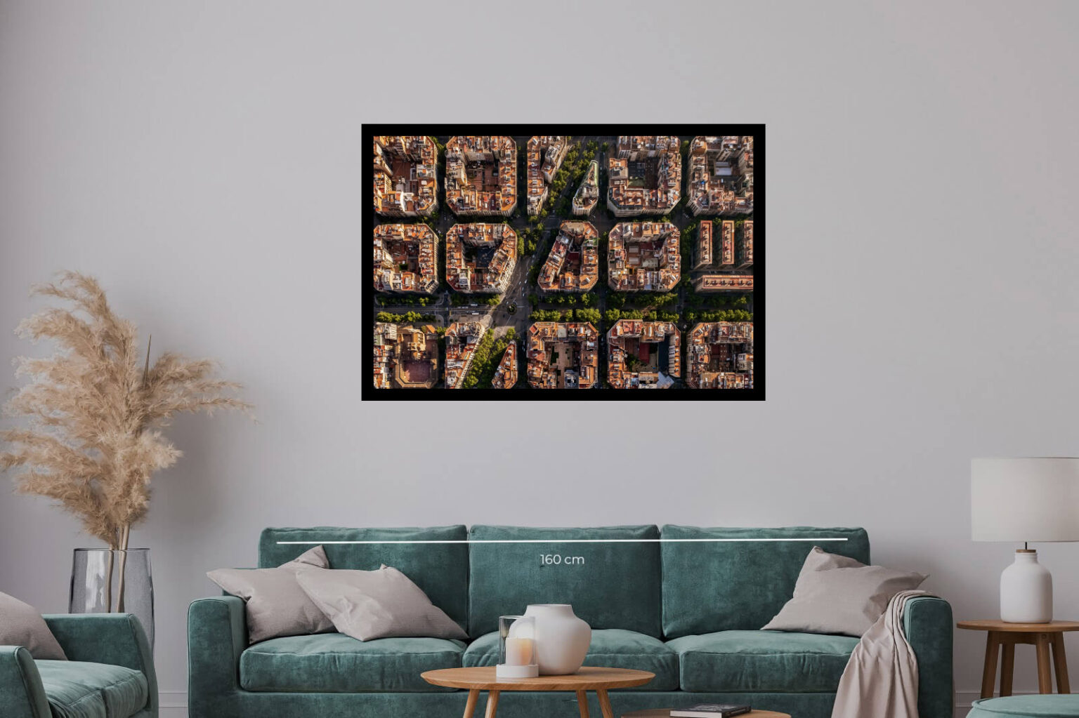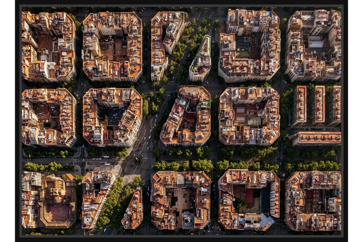 Впечатляваща аерофотография на Барселона, където симетричните квартали и уличната мрежа оформят уникален градски дизайн, показващ съвременната архитектура на града.