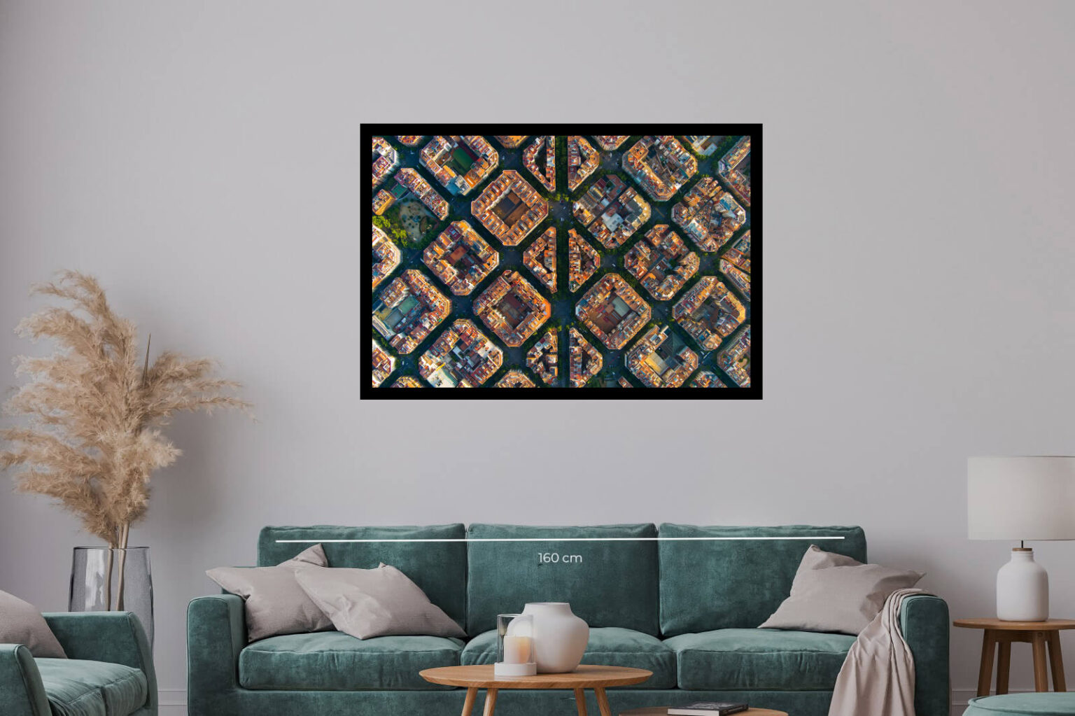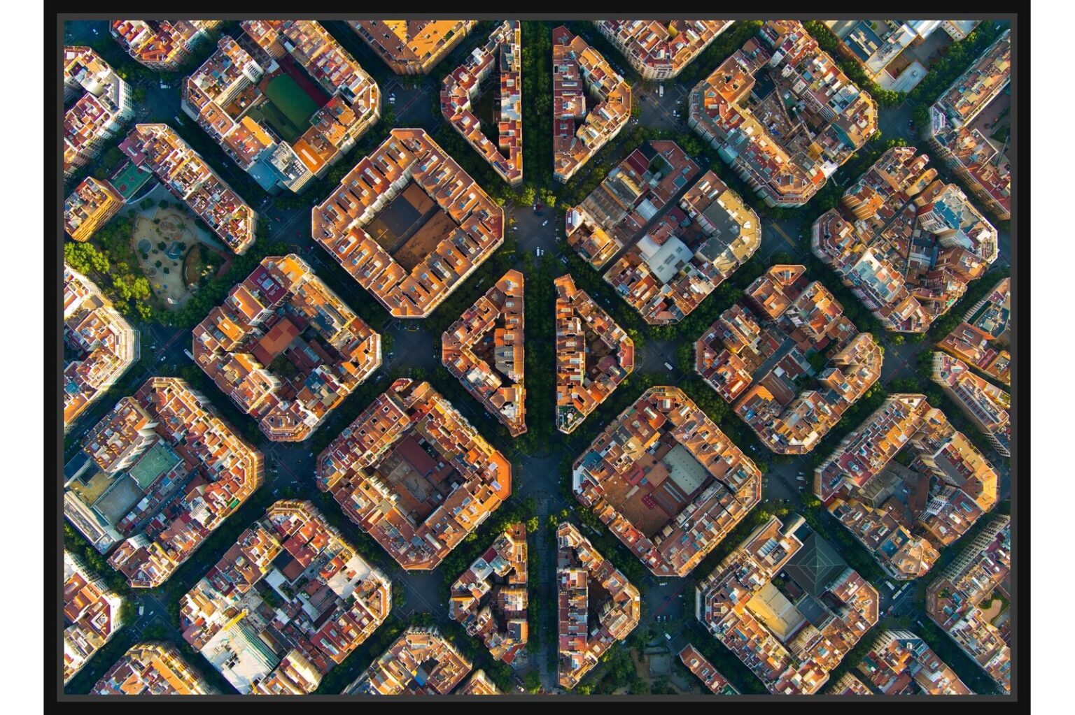 Аерофотография на кварталите на Барселона, показваща симетрията и красотата на градската структура от птичи поглед.