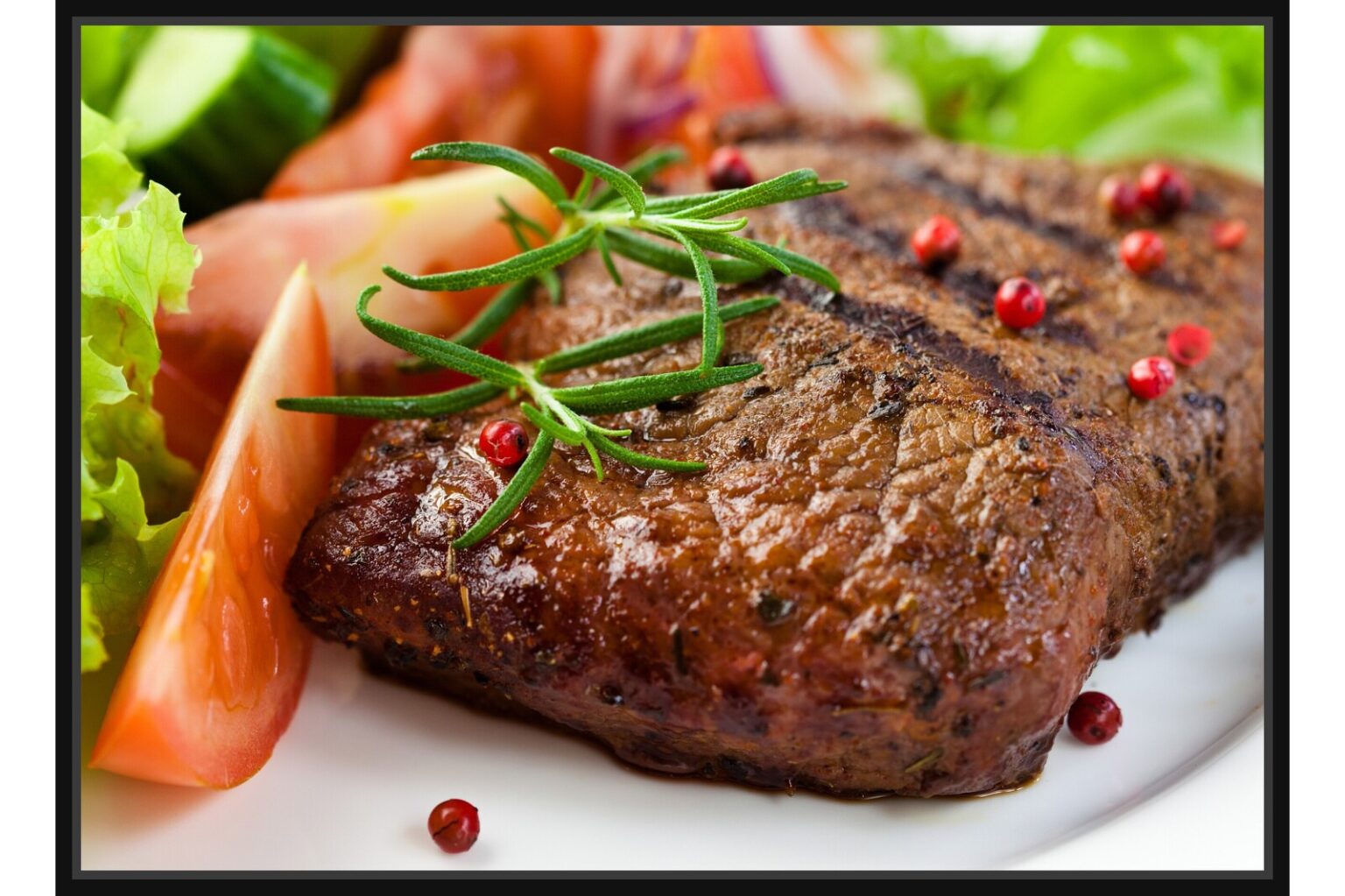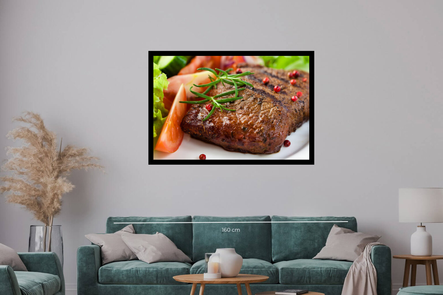 Класическа пържола, приготвена на скара и поднесена със свежи зеленчуци – домати, краставици и салата. Декорирана с розмарин и червен пипер, тя носи усещане за гурме изживяване.