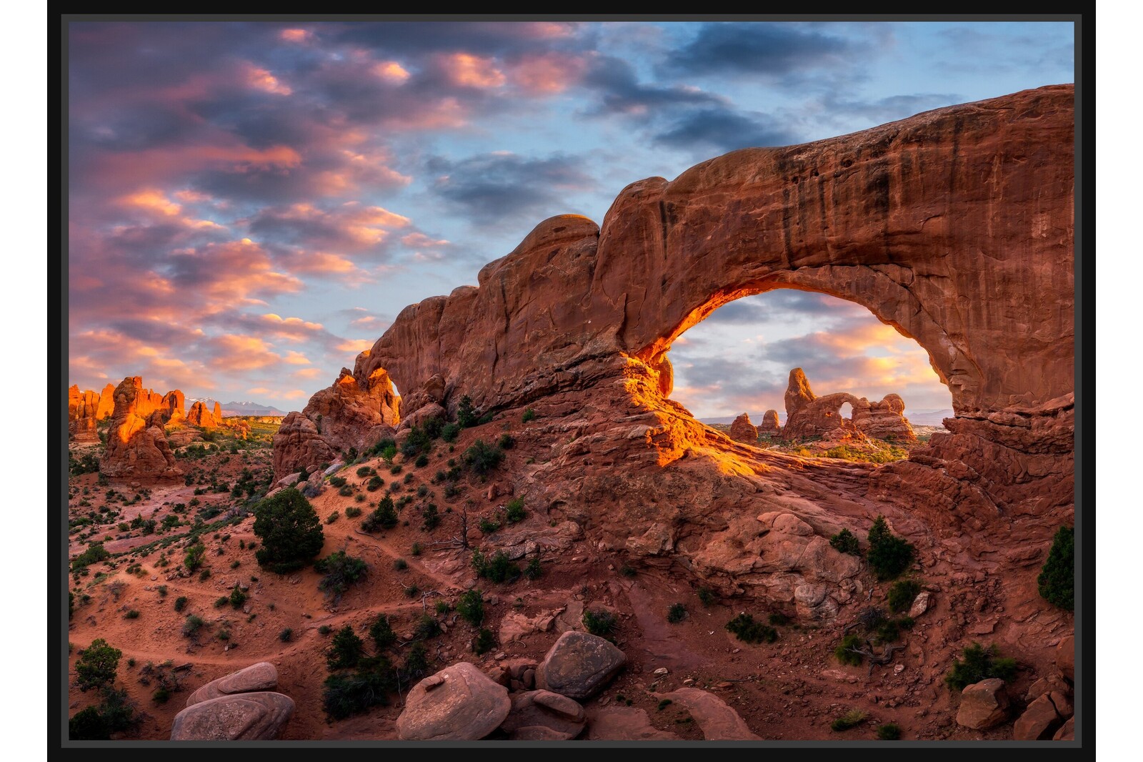 Златисти скални арки и червени формации в Арчес Нешънъл Парк, осветени от топлите лъчи на залеза. Една от най-живописните гледки в САЩ.