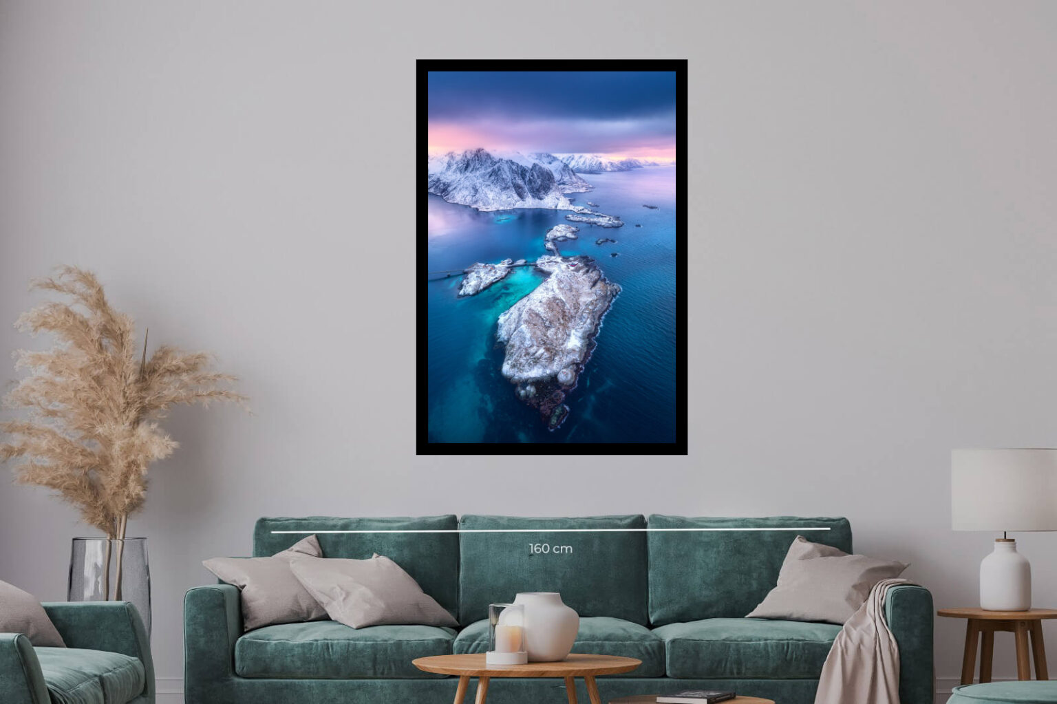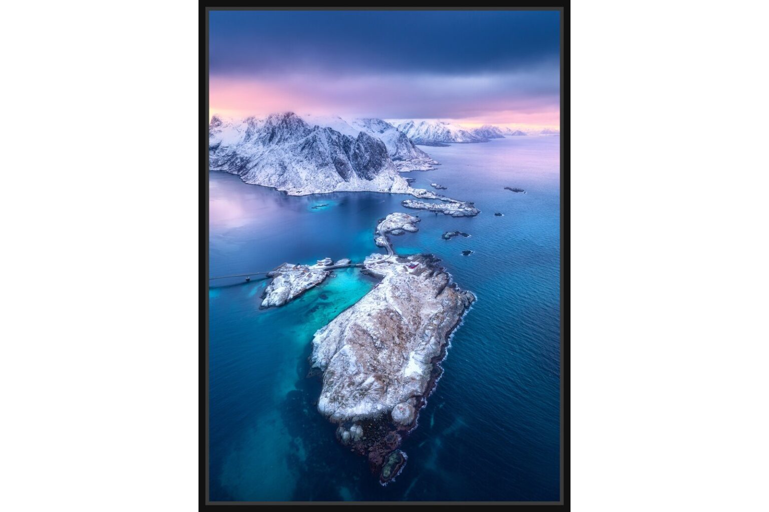Въздушна снимка на арктически острови, заобиколени от студени води и заснежени планини. Залезът оцветява небето в розово и синьо.