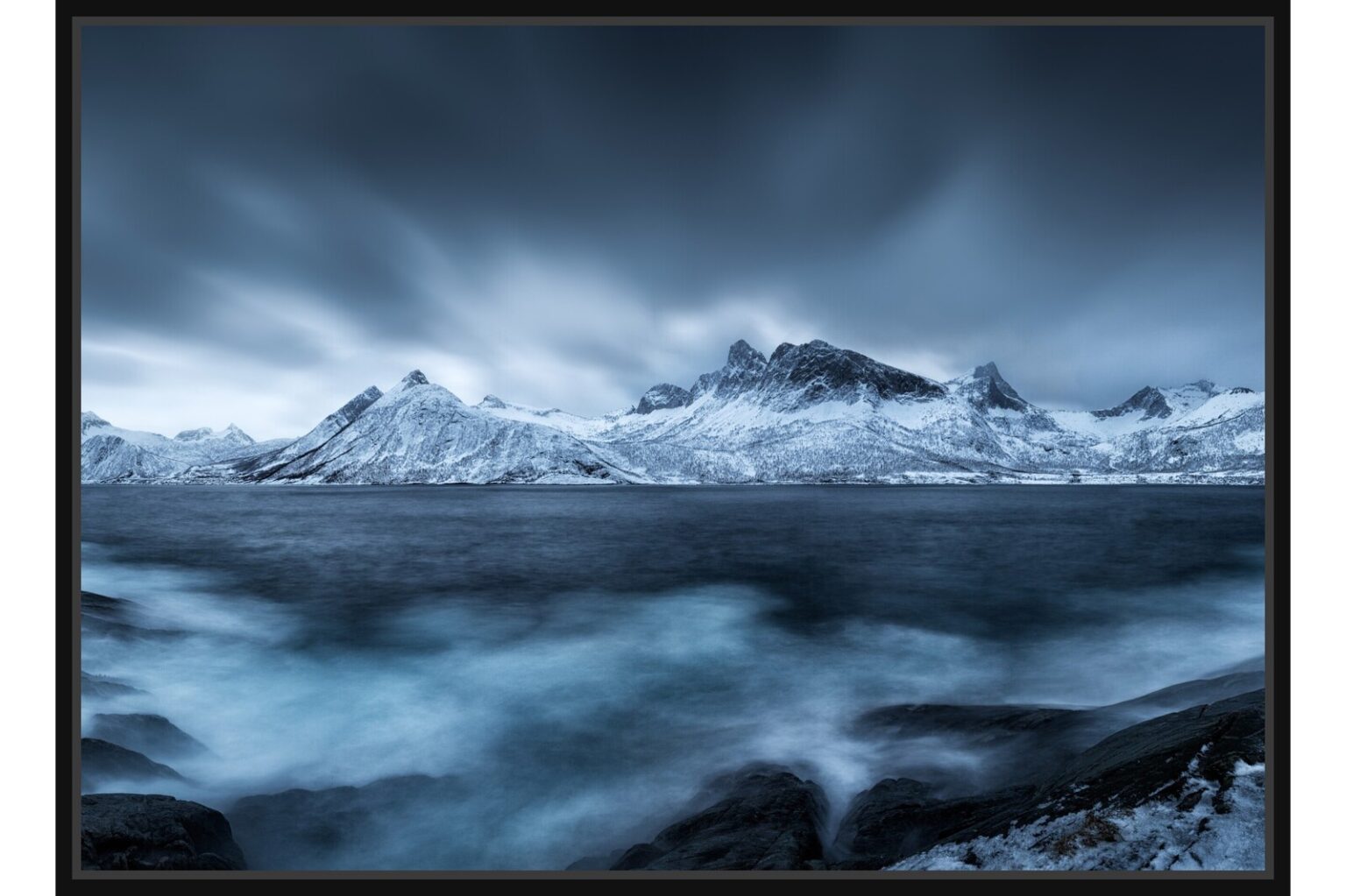 Сурова и драматична сцена от Арктика с величествени заснежени планини и бурно тъмносиньо море. Атмосфера на дива природа и студена красота.