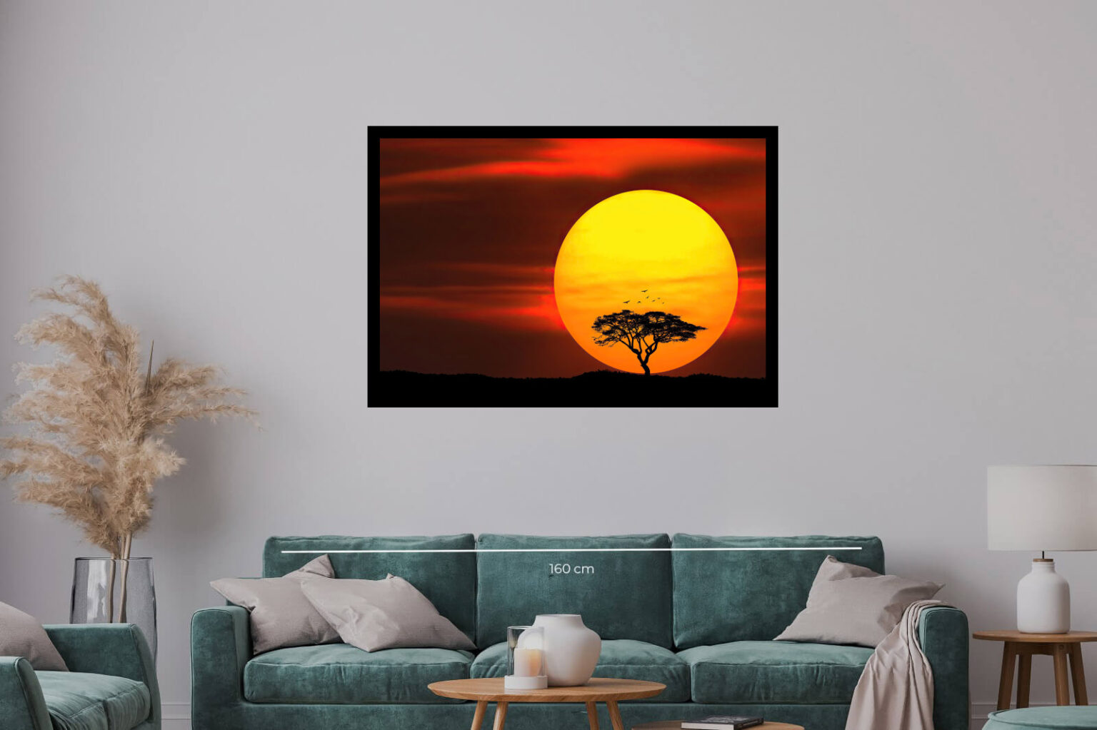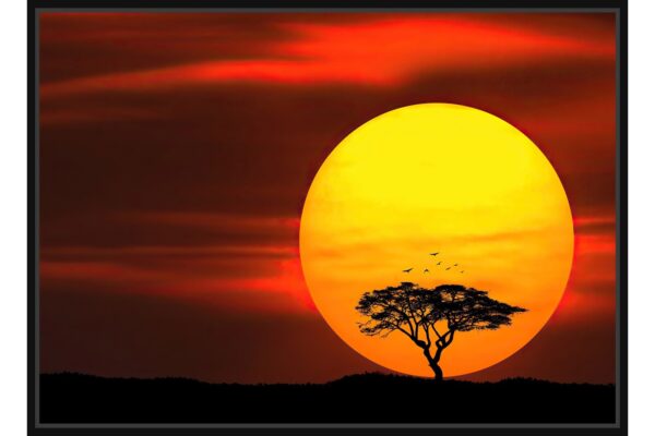Величествен залез в саваната с огромно оранжево слънце и силует на самотна акация. Птици прелитат в небето, добавяйки символика на свобода и хармония с природата.