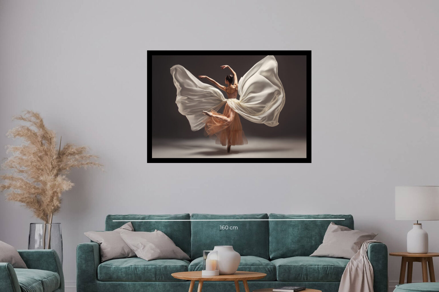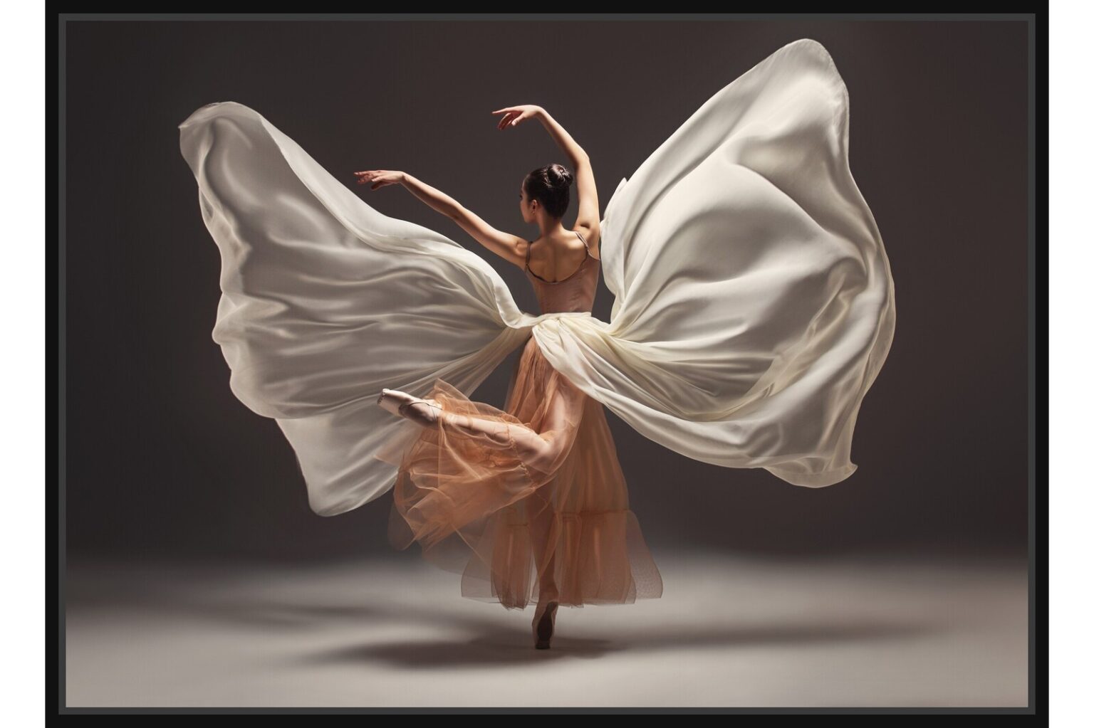 Елегантна балерина в бежова рокля с разперени бели платна, създаващи ефект на летящи крила.