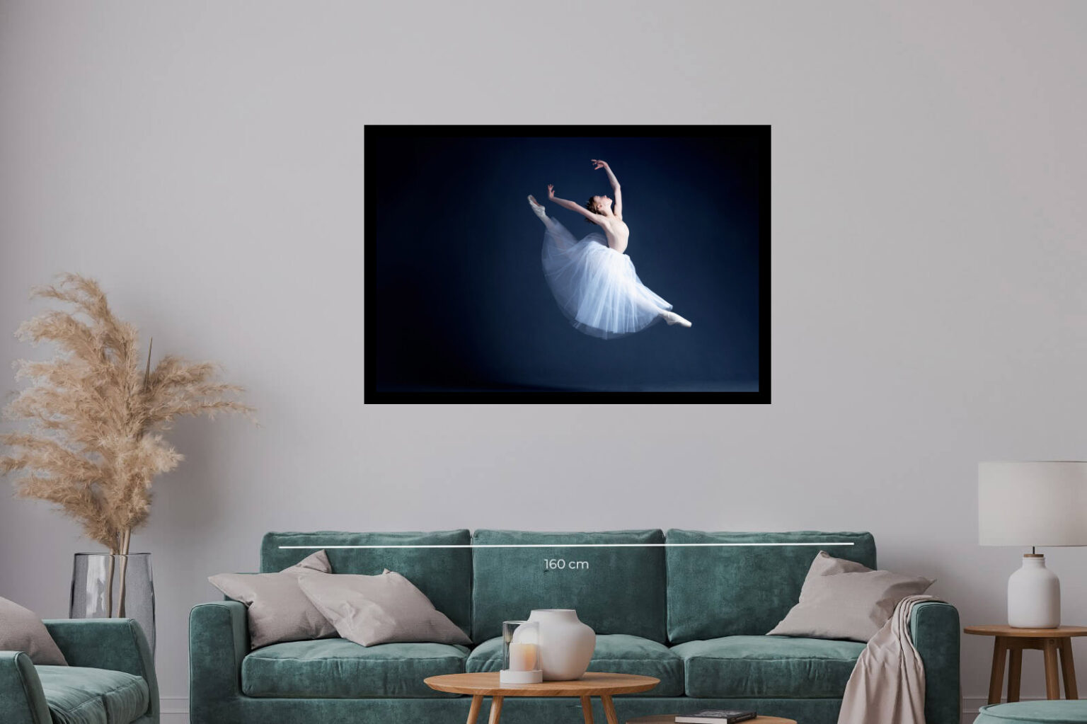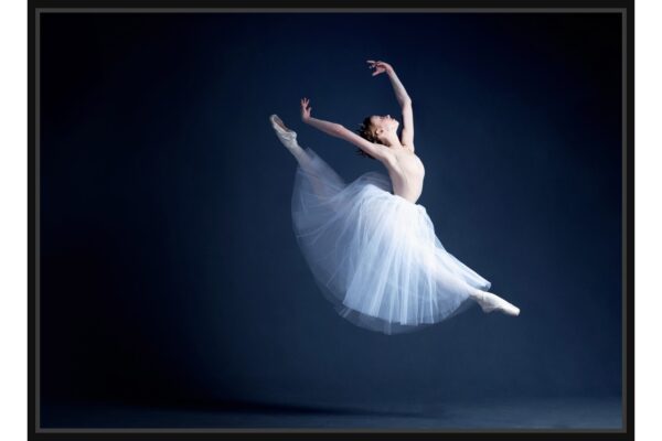 Фотография на балерина в момент на скок, облечена в бяла тюлена пола. Снимката улавя изящество, грация и сила, предадени чрез динамичното движение.