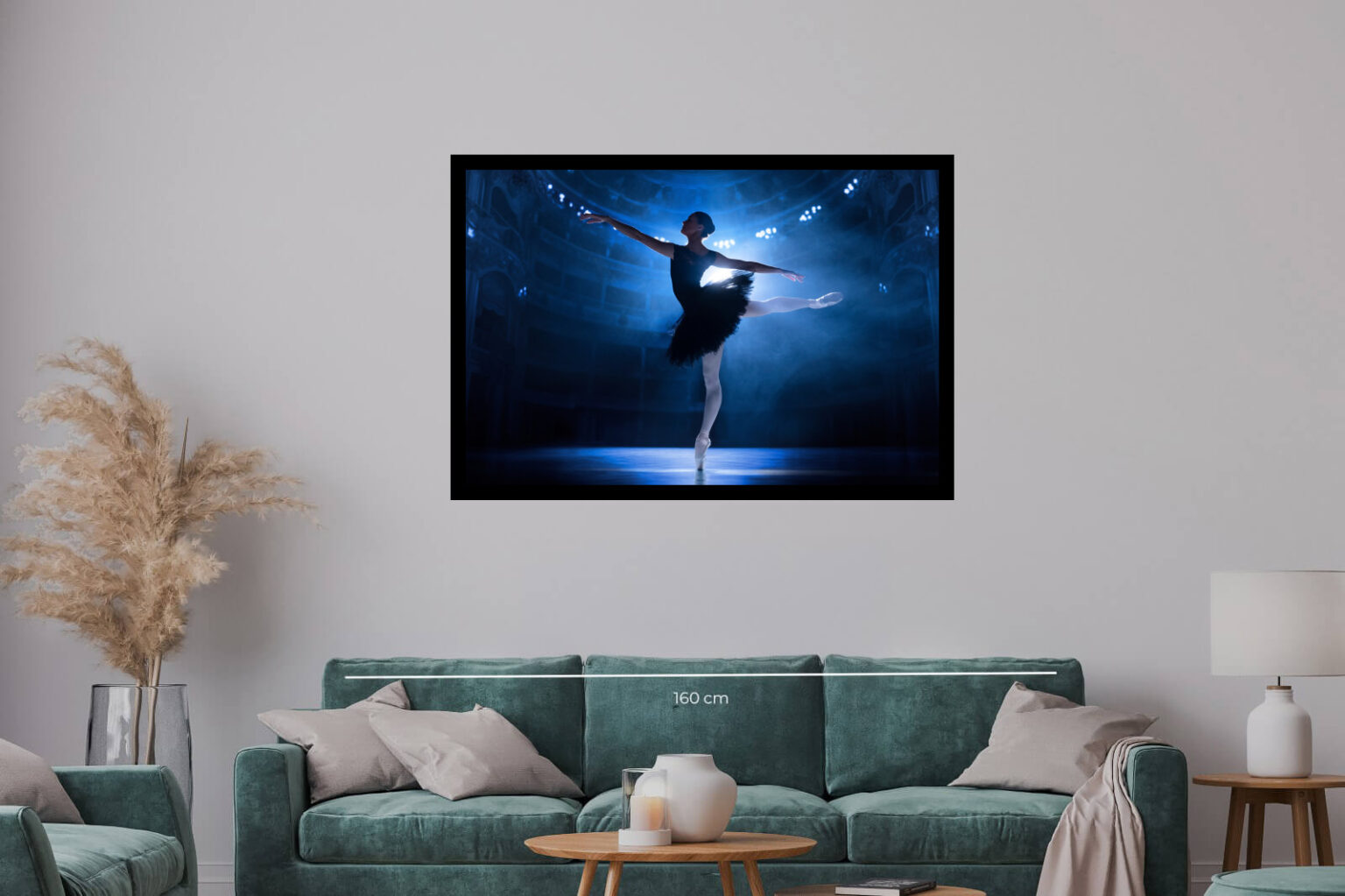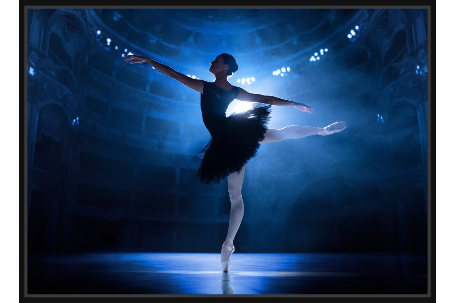 Изящна балерина в черен костюм, заснета на сцената в театър със синьо осветление и драматична атмосфера.