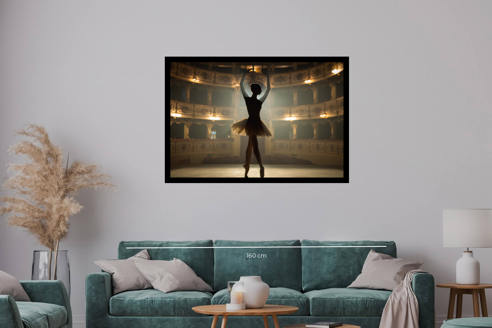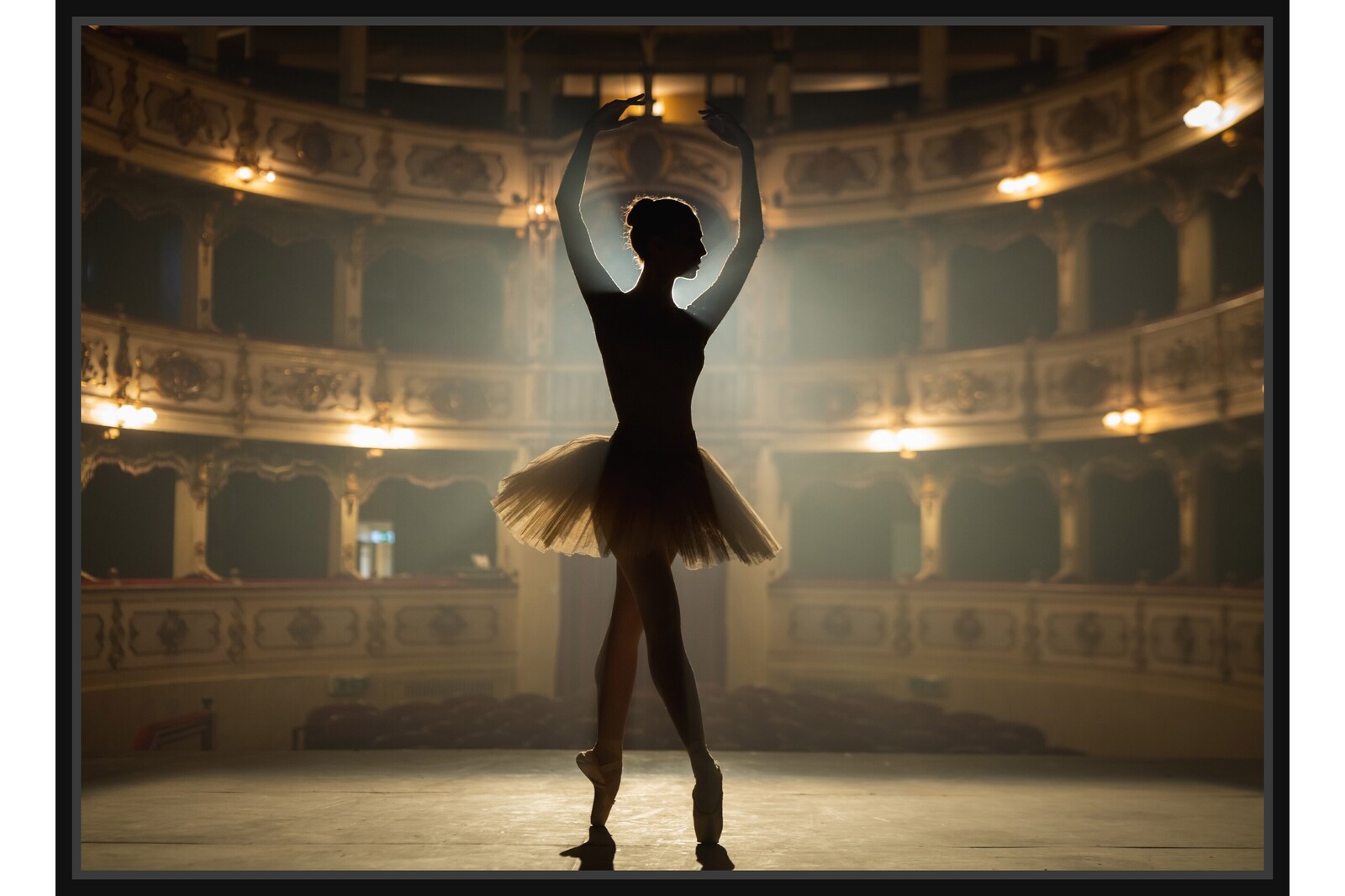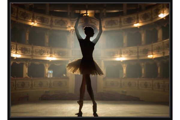 Силует на балерина на театрална сцена, осветена от топла светлина, която подчертава изяществото на позата ѝ.