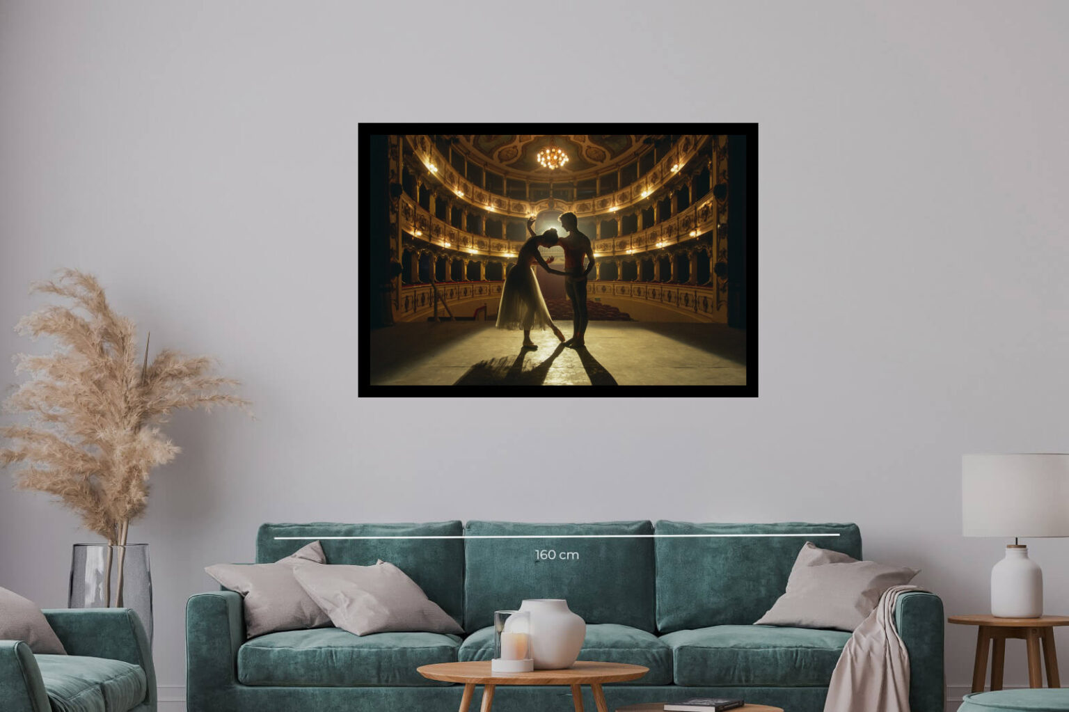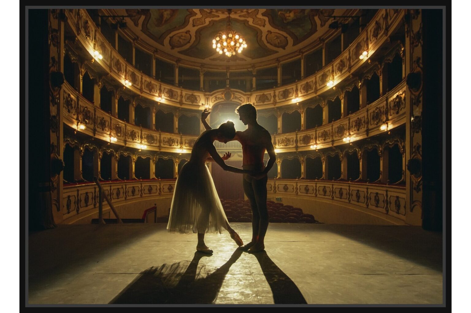 Емоционален кадър на двама балетисти на сцената на величествен театър, обгърнати от топла светлина и класическа архитектура.