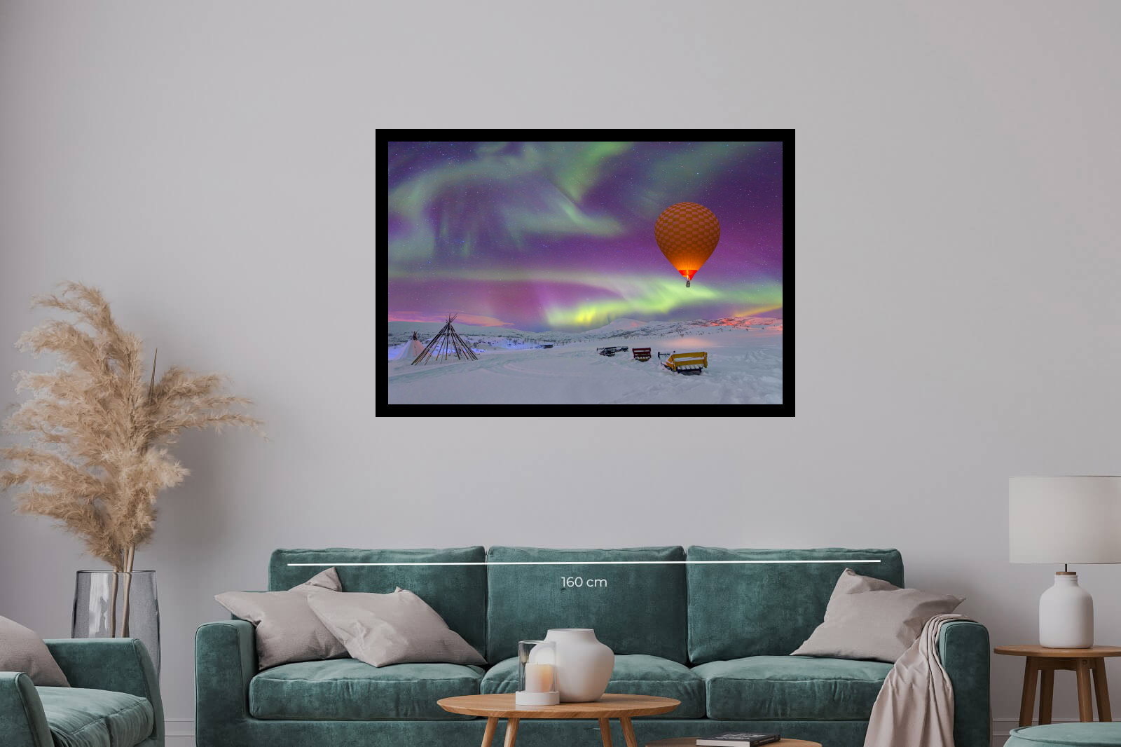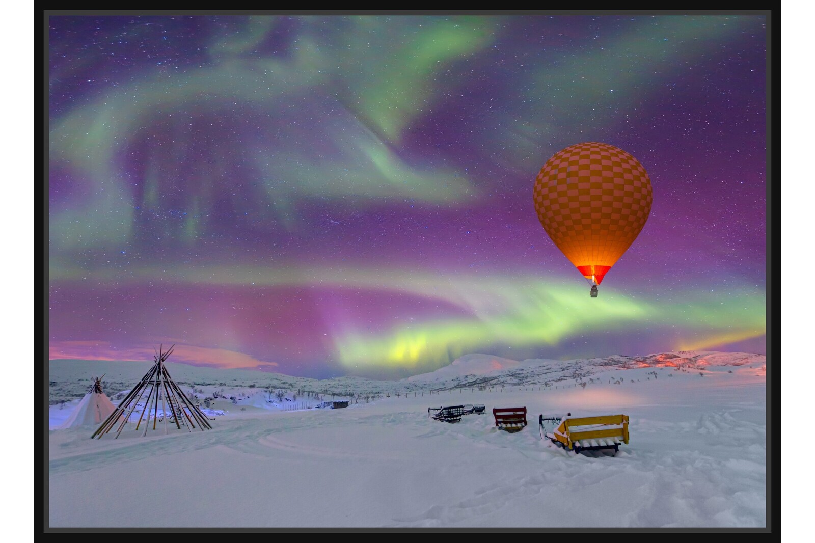 Цветен въздушен балон се издига над зимен пейзаж, озарен от пурпурни и зелени светлини на северното сияние. Уникален контраст на студ и топли цветове.