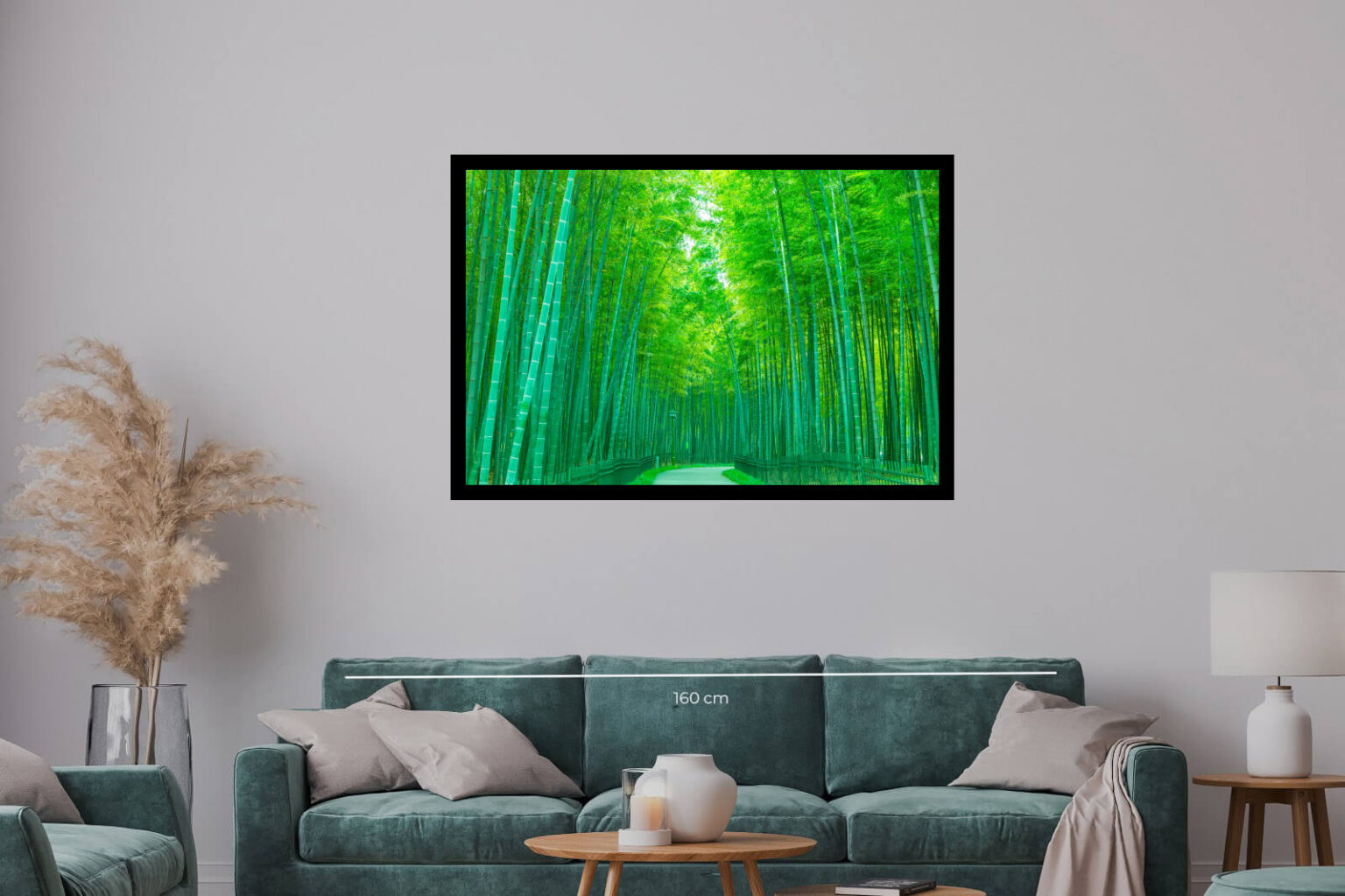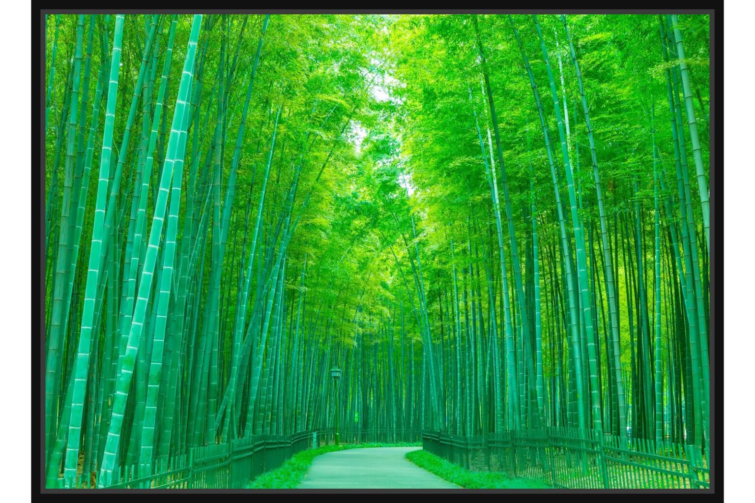Фотография на гъста бамбукова гора с пътека, която минава през високите стебла. Зелените тонове създават усещане за спокойствие, свежест и хармония с природата.