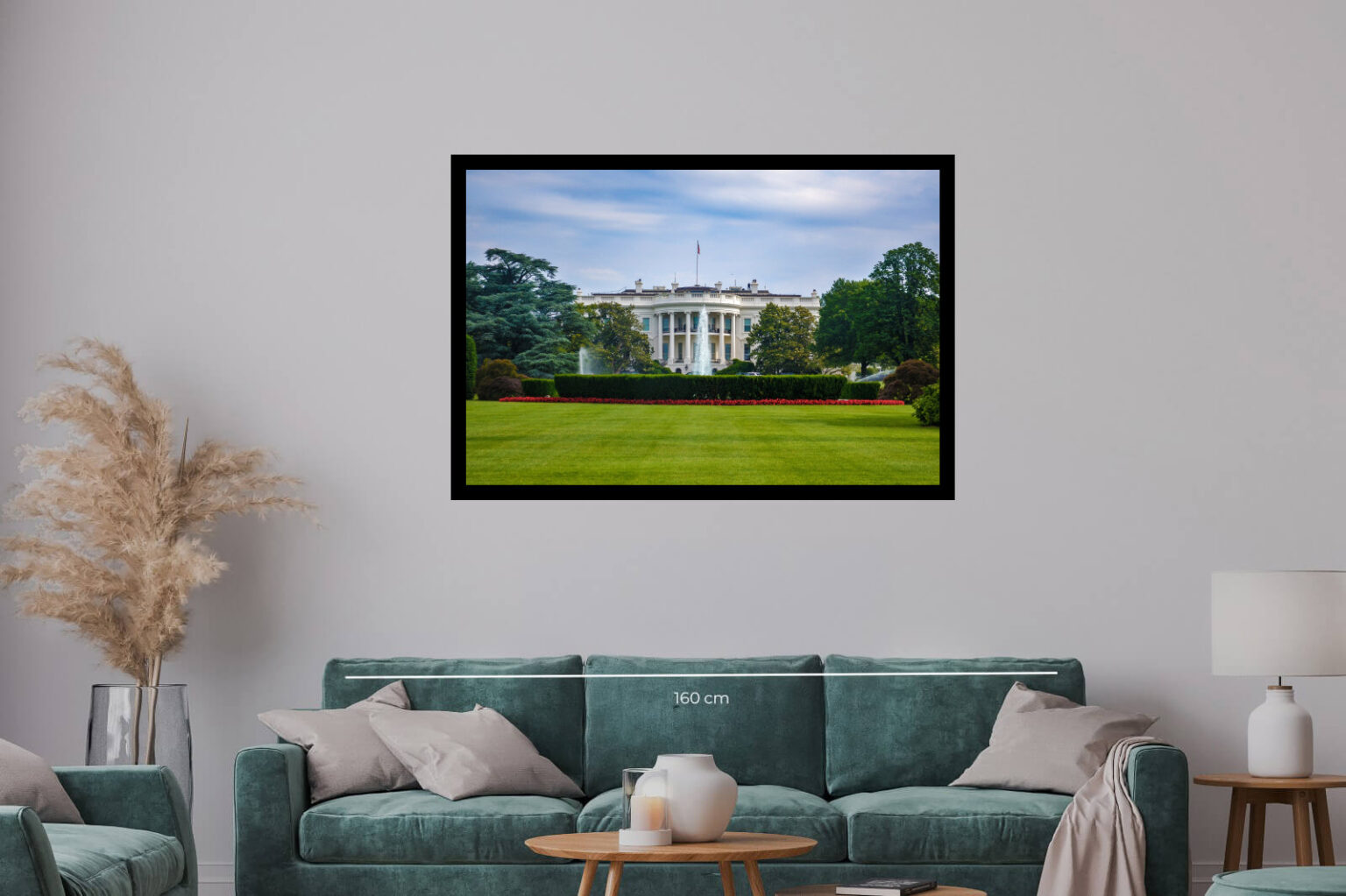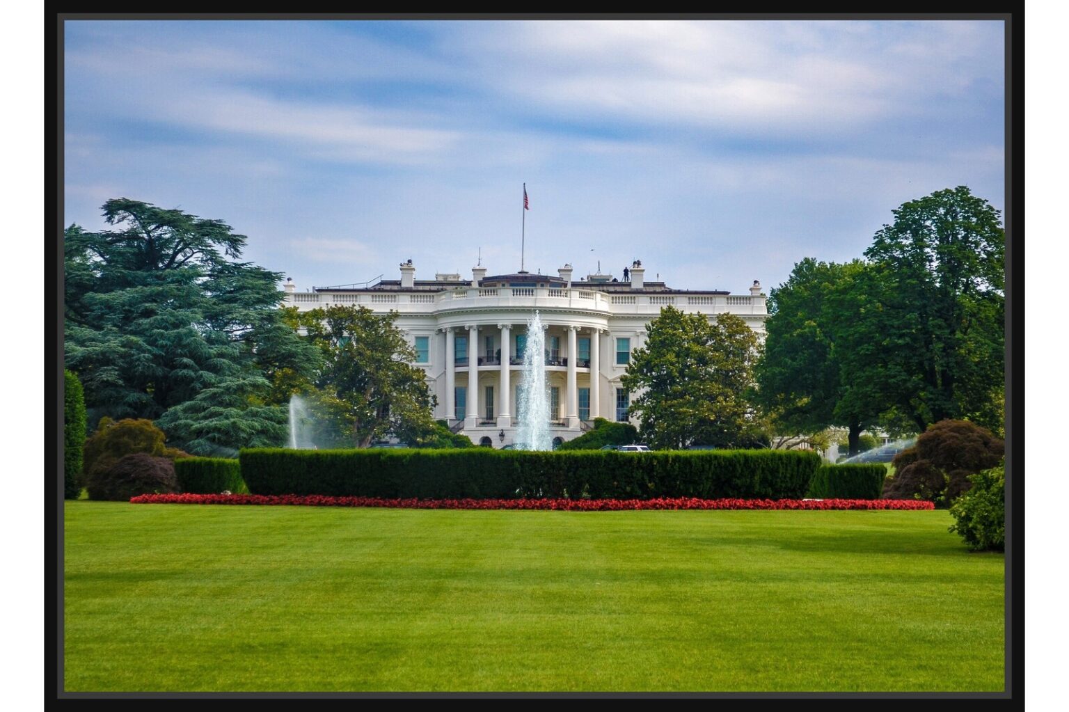 Фотография на Белия дом, символ на Съединените щати, обграден от зелени градини и фонтани. Кадърът излъчва хармония и историческа стойност.