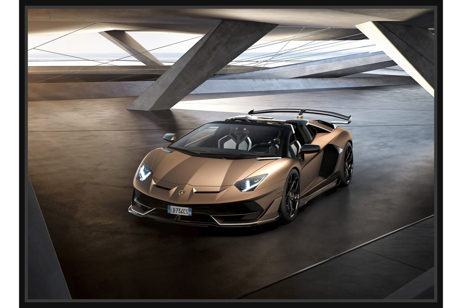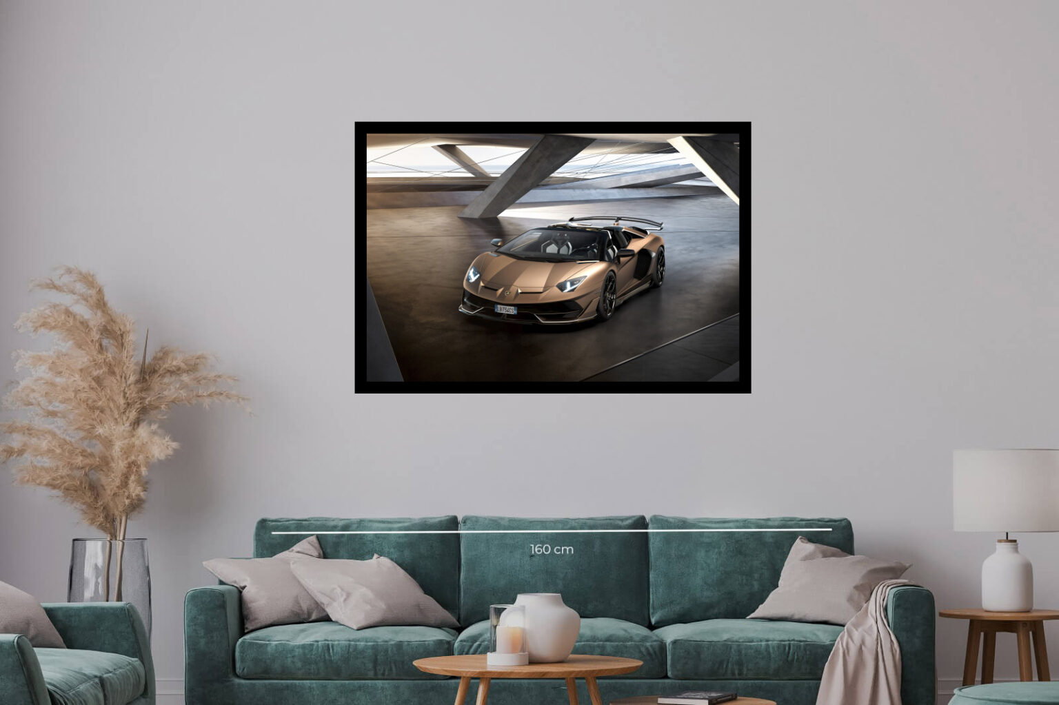 Силна композиция на бронзов Lamborghini, заснето в пространство с модерна бетонна архитектура. Автомобилът излъчва класа, стил и мощ в градски контекст.