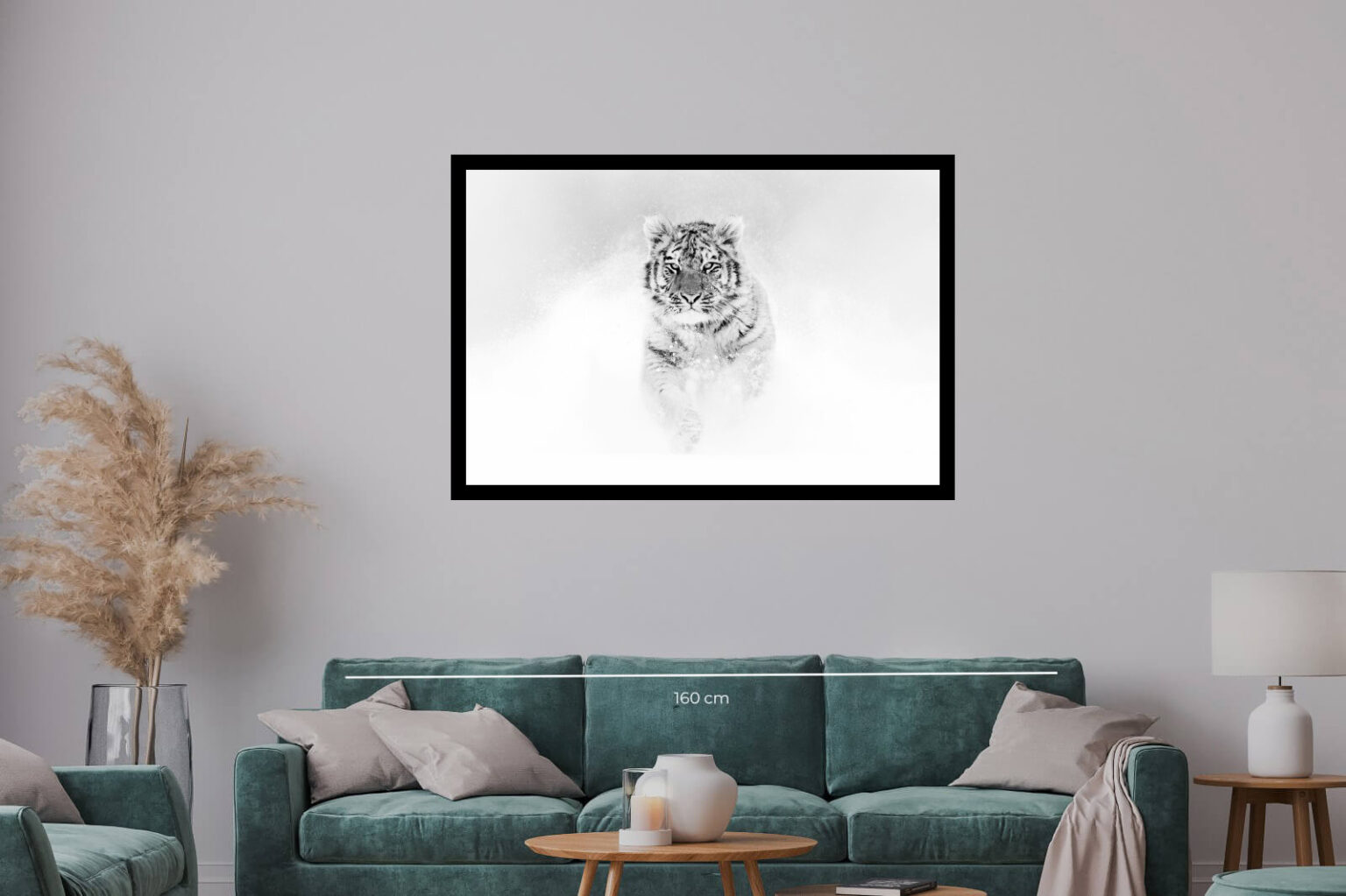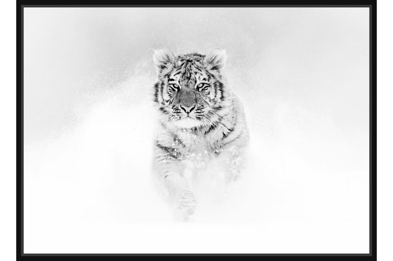 Артистична черно-бяла фотография на тигър в движение, заснет в снежна среда. Белият фон и снежните пръски създават усещане за енергия и свобода. Кадърът е едновременно динамичен и минималистичен.