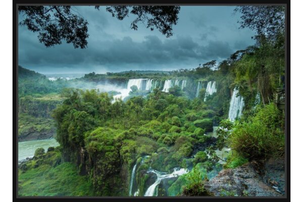 Мощните води на водопадите Игуасу се спускат сред гъстата зеленина на тропическата джунгла. Мъглата и облаците подсилват драматичния ефект и величието на тази природна сила.