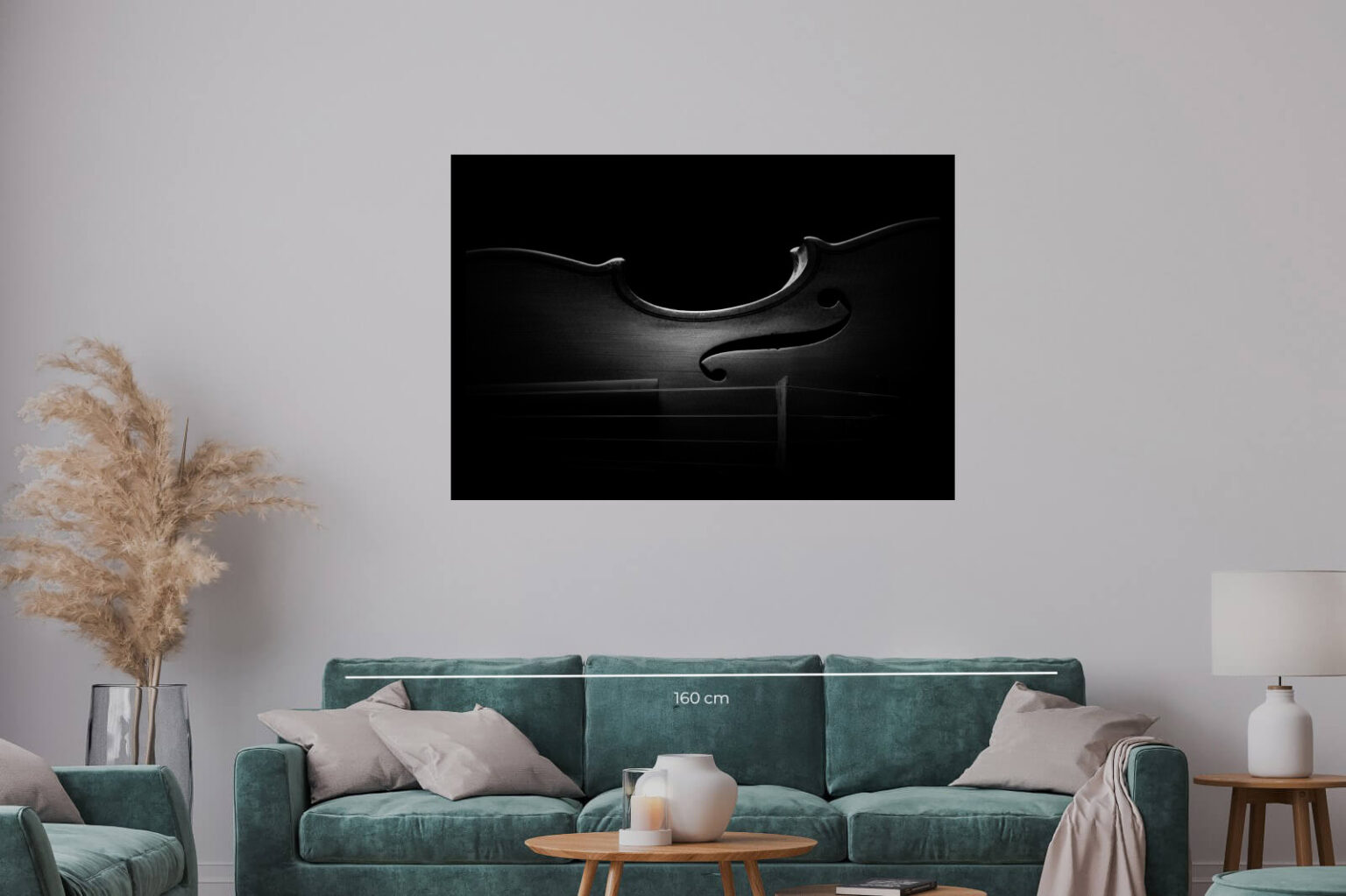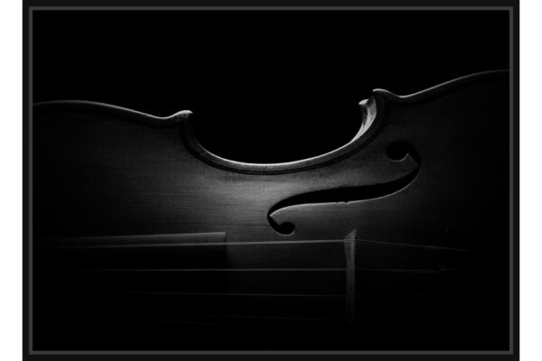 Черно-бяла художествена фотография на цигулка, заснета в близък план. Силуетът и контурите на инструмента се открояват срещу тъмен фон, придавайки мистериозност и елегантност. Изображение, което носи усещане за класика и вечна музикалност.