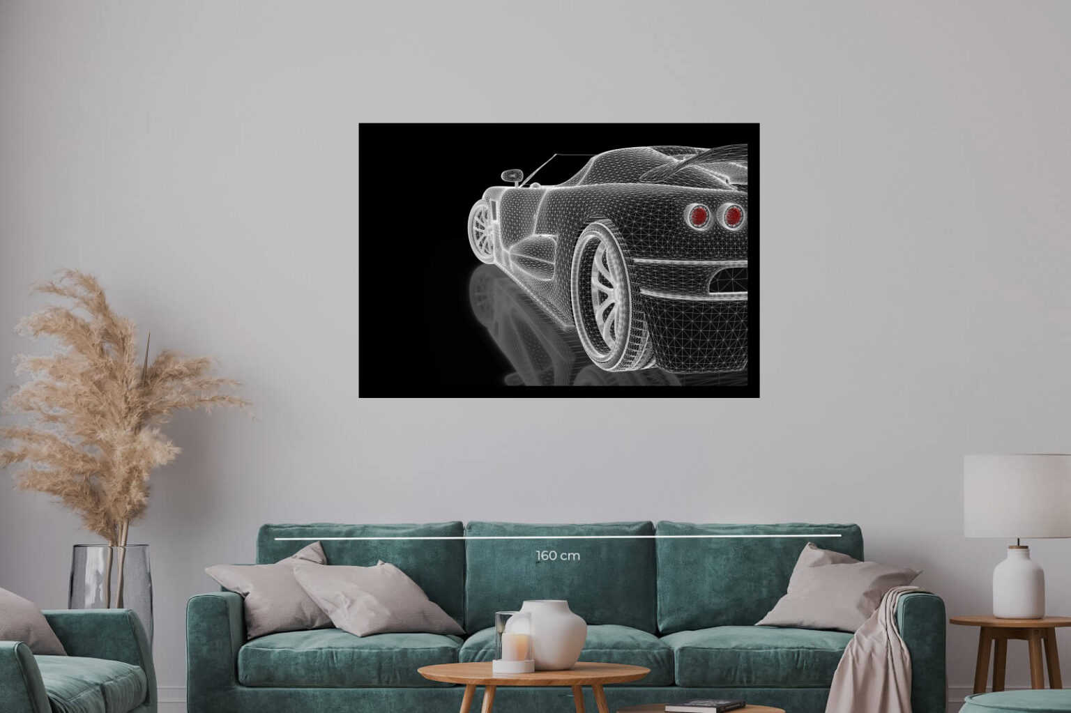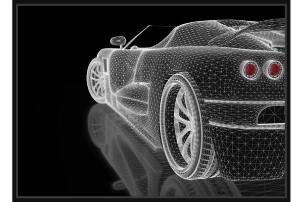 Абстрактна визуализация на спортен автомобил, изграден от 3D мрежа. Дигиталният стил и геометричните линии създават модерна и технологична визия. Силуетът на автомобила е динамичен и символизира скорост и иновации.