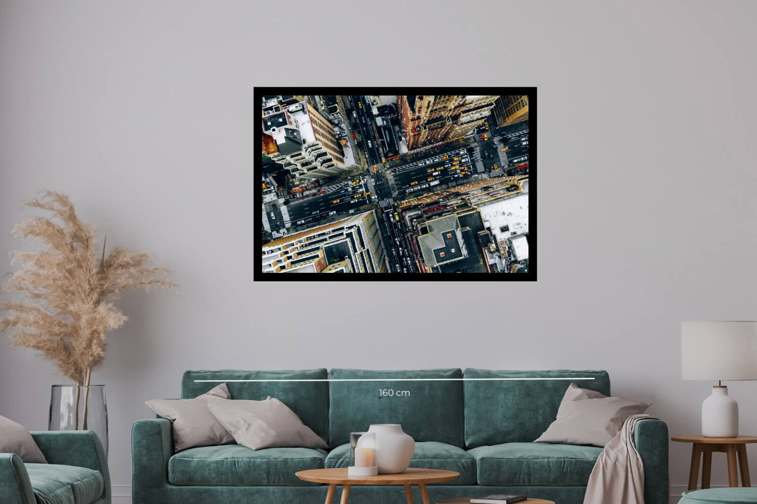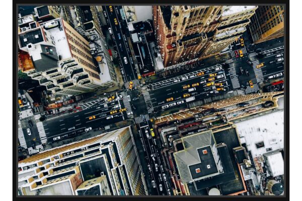 Впечатляваща аероснимка на натоварен градски кръстопът. Жълтите таксита и движението на автомобилите създават динамична композиция, а архитектурните линии на сградите подчертават ритъма на мегаполиса.