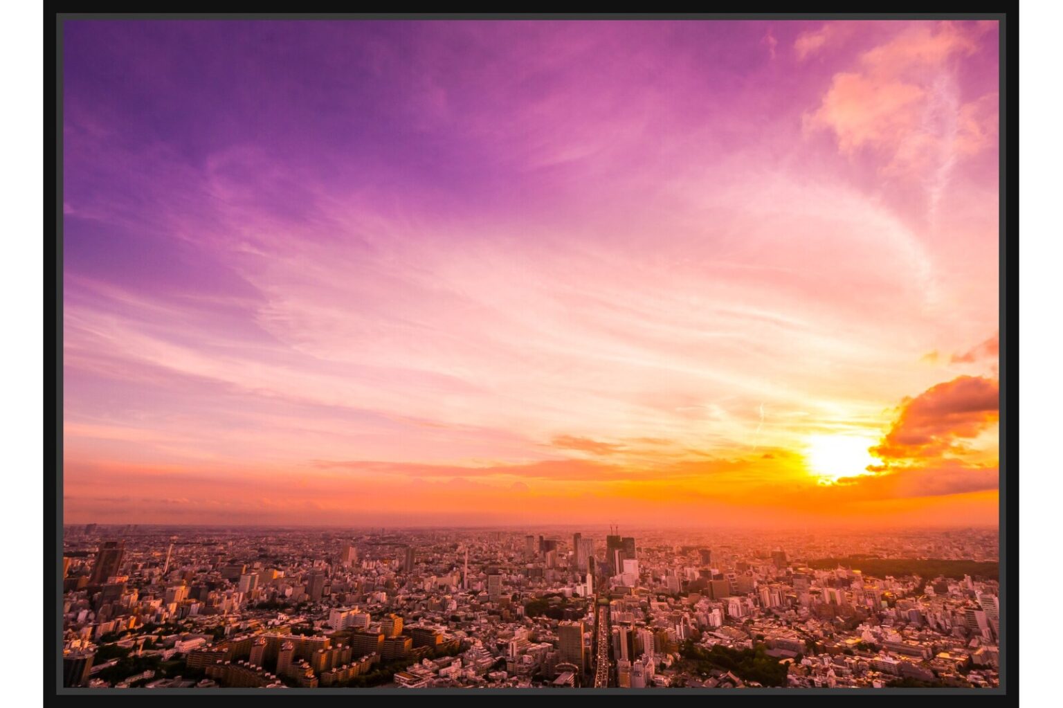 Широк поглед към голям град по време на залез, с драматично оцветено небе в оранжево и розово. Снимката създава усещане за величие и спокойствие.