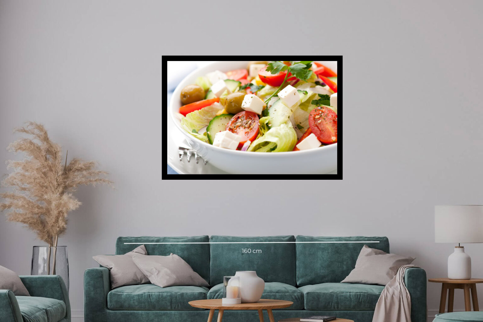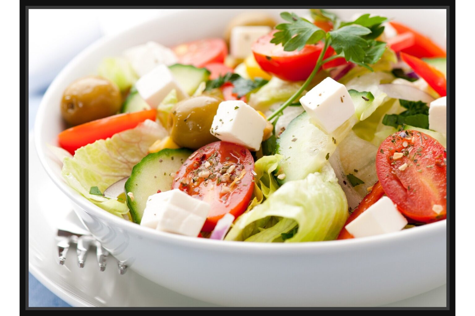 Класическа гръцка салата с домати, краставици, маслини и сирене, поднесена с пресни подправки и зехтин. Цветна и апетитна визия, която подчертава свежестта на продуктите.