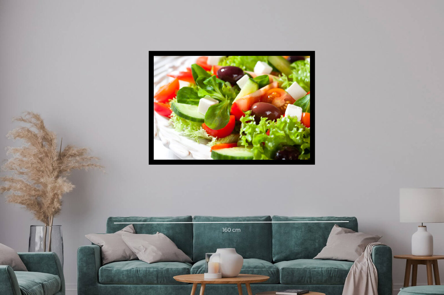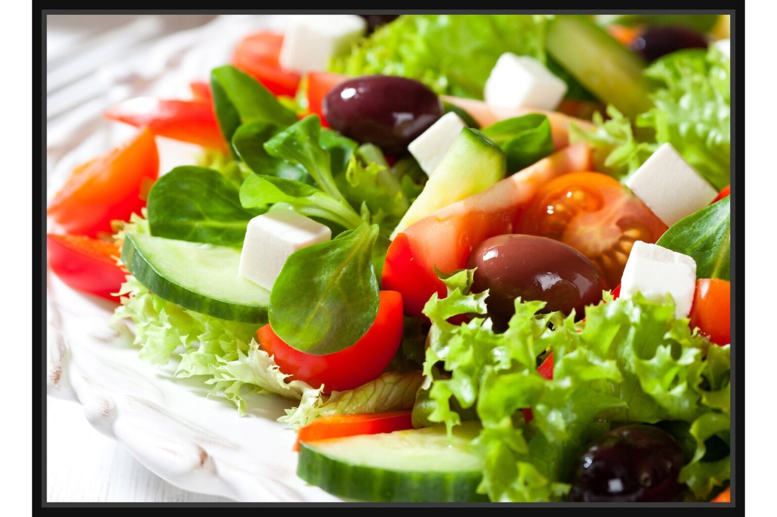 Фотография на свежа гръцка салата със зелени листа, маслини, домати и кубчета сирене фета. Ярките цветове подчертават свежестта и здравословния характер на ястието.