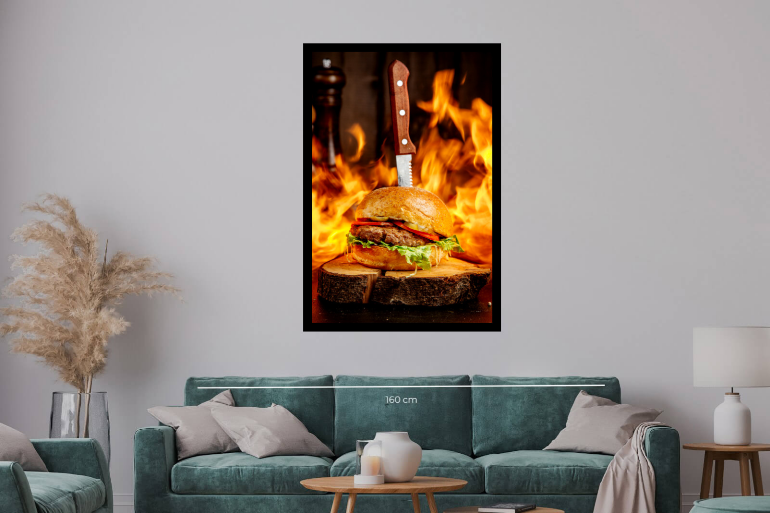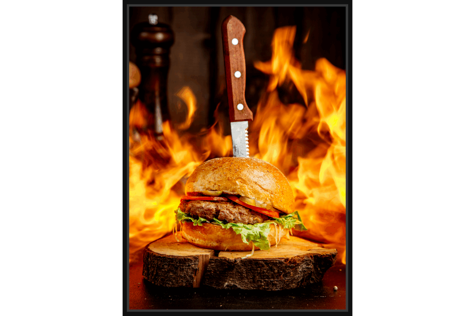 Апетитен бургер, сервиран върху дървен пън и заобиколен от пламъци, които създават драматична и впечатляваща атмосфера. Сочната телешка питка, свежата салата, доматът и хлебчето със златиста коричка подчертават усещането за автентичен вкус и кулинарна страст.
