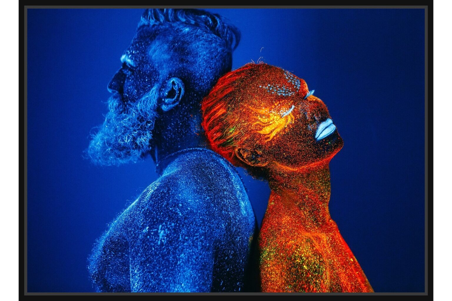 Фотография на двама души гръб до гръб – единият в синя флуоресцентна светлина, другият в оранжева. Тъмният фон подчертава контраста и ярките бои.