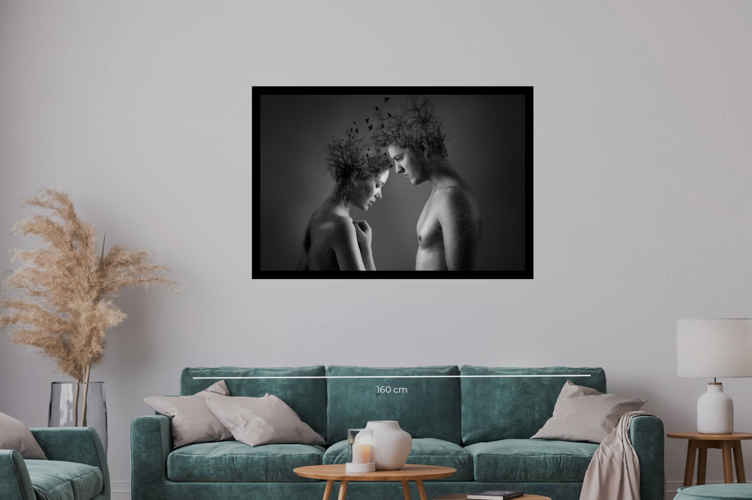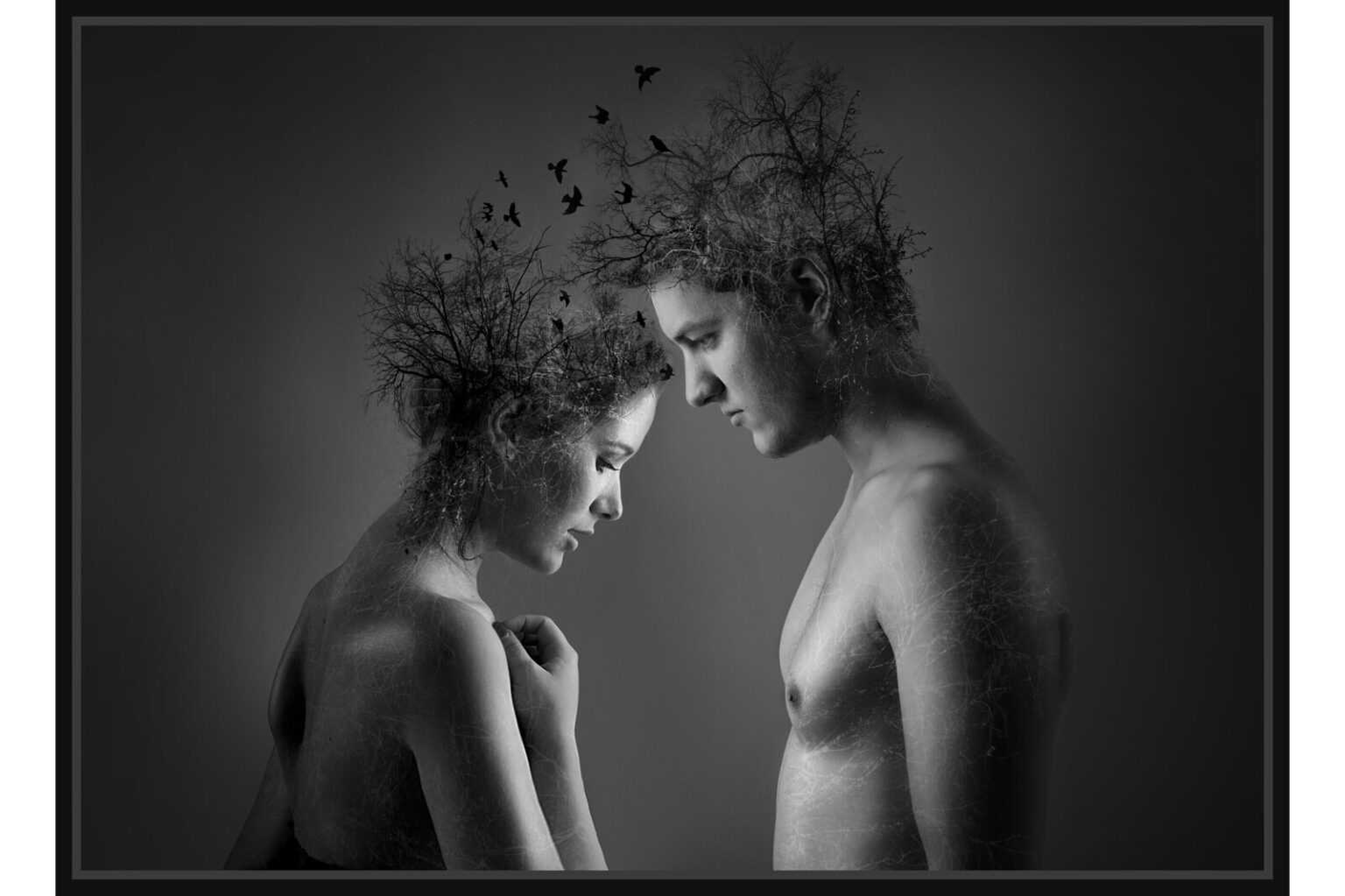 Черно-бял концептуален портрет на мъж и жена, преплетени с изображения на дървета и птици. Фотографията символизира връзката между човека и природата, съчетавайки реализъм и художествена фантазия.