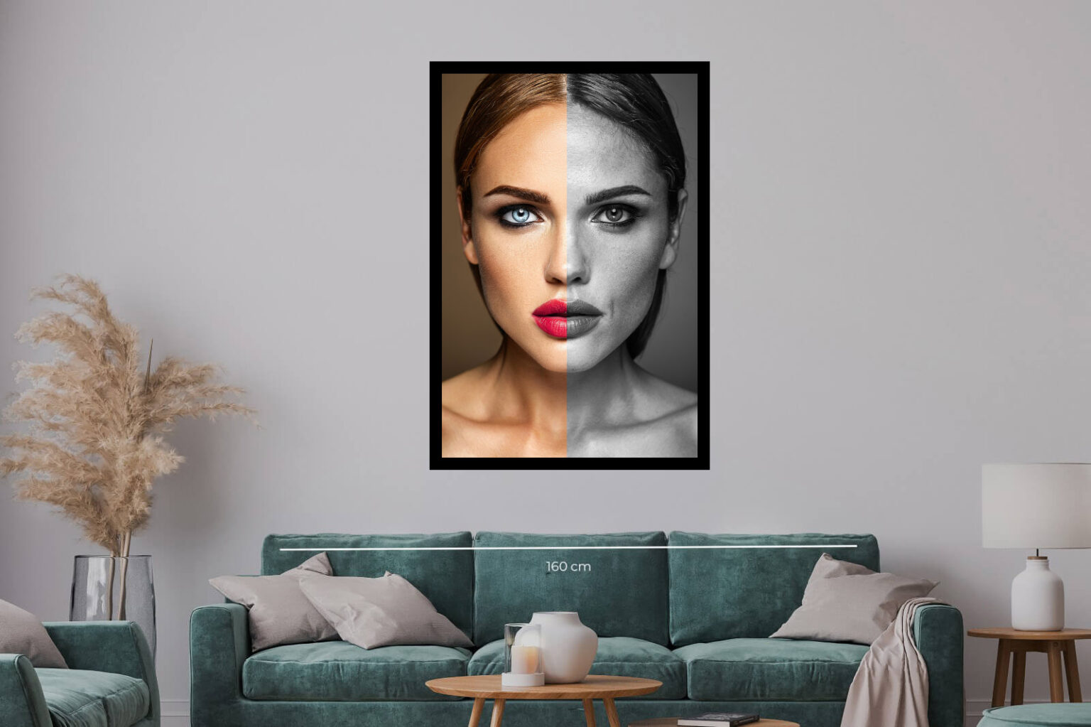 Художествен портрет на жена, разделен на цветна и черно-бяла половина, символизиращ контраст между минало и настояще.