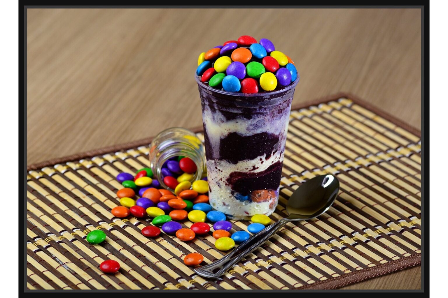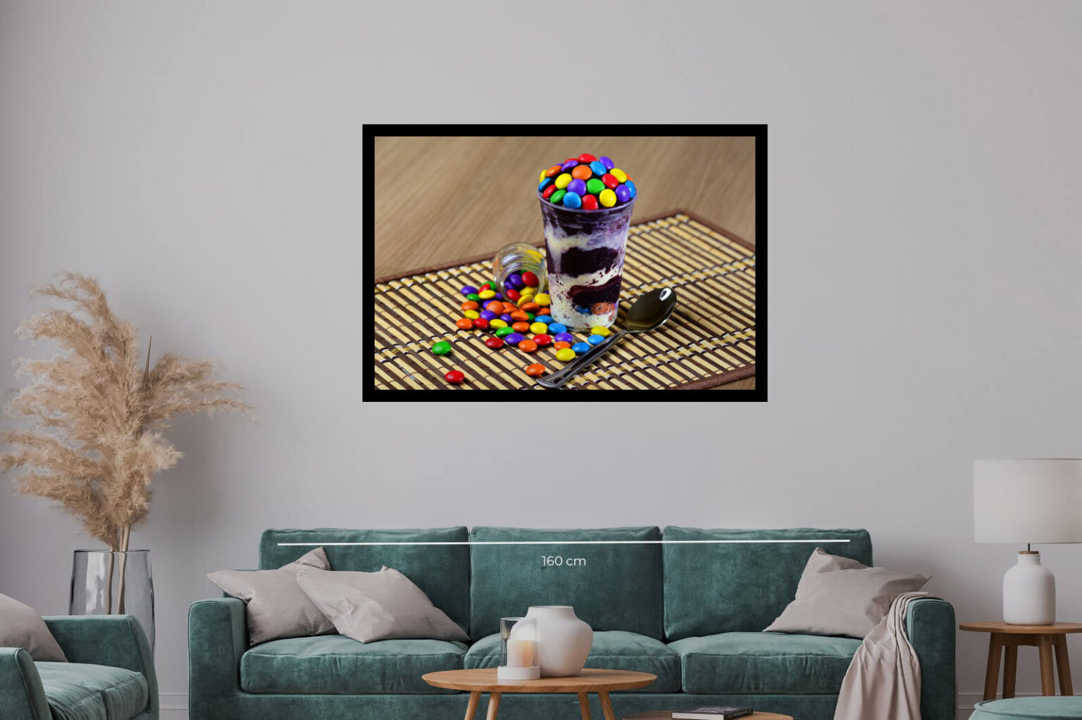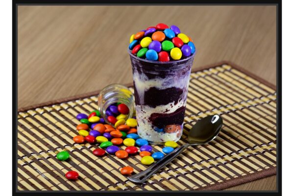 Апетитен десерт в прозрачна чаша, украсен с цветни шоколадови дражета, сервирани върху постелка от бамбук. Ярките цветове на сладките създават настроение и подчертават игривия и свеж характер на изображението.