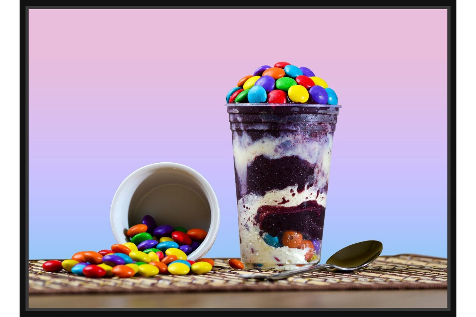 Сладък десерт в прозрачна чаша, пълен с крем и украсен с цветни дражета, заснет на ярък розово-син фон. Игривото изображение излъчва енергия и радост, подходящо за представяне на креативни сладкарски изделия.