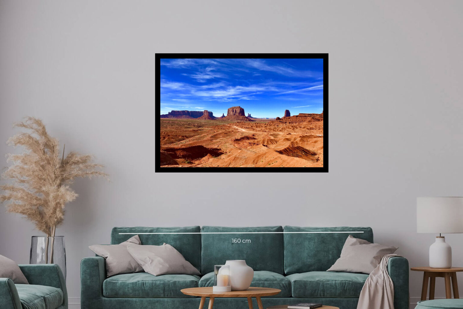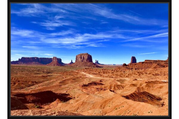 Широк пейзаж на Долината Монюмент в Аризона със синьо небе и червеникави скални образувания – емблематична природна красота на САЩ.