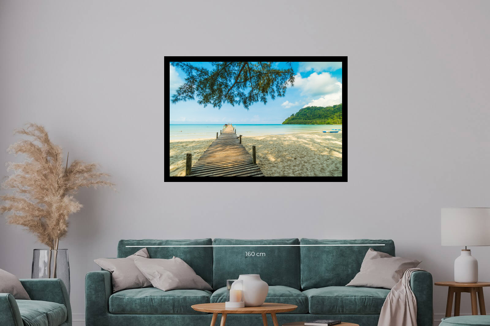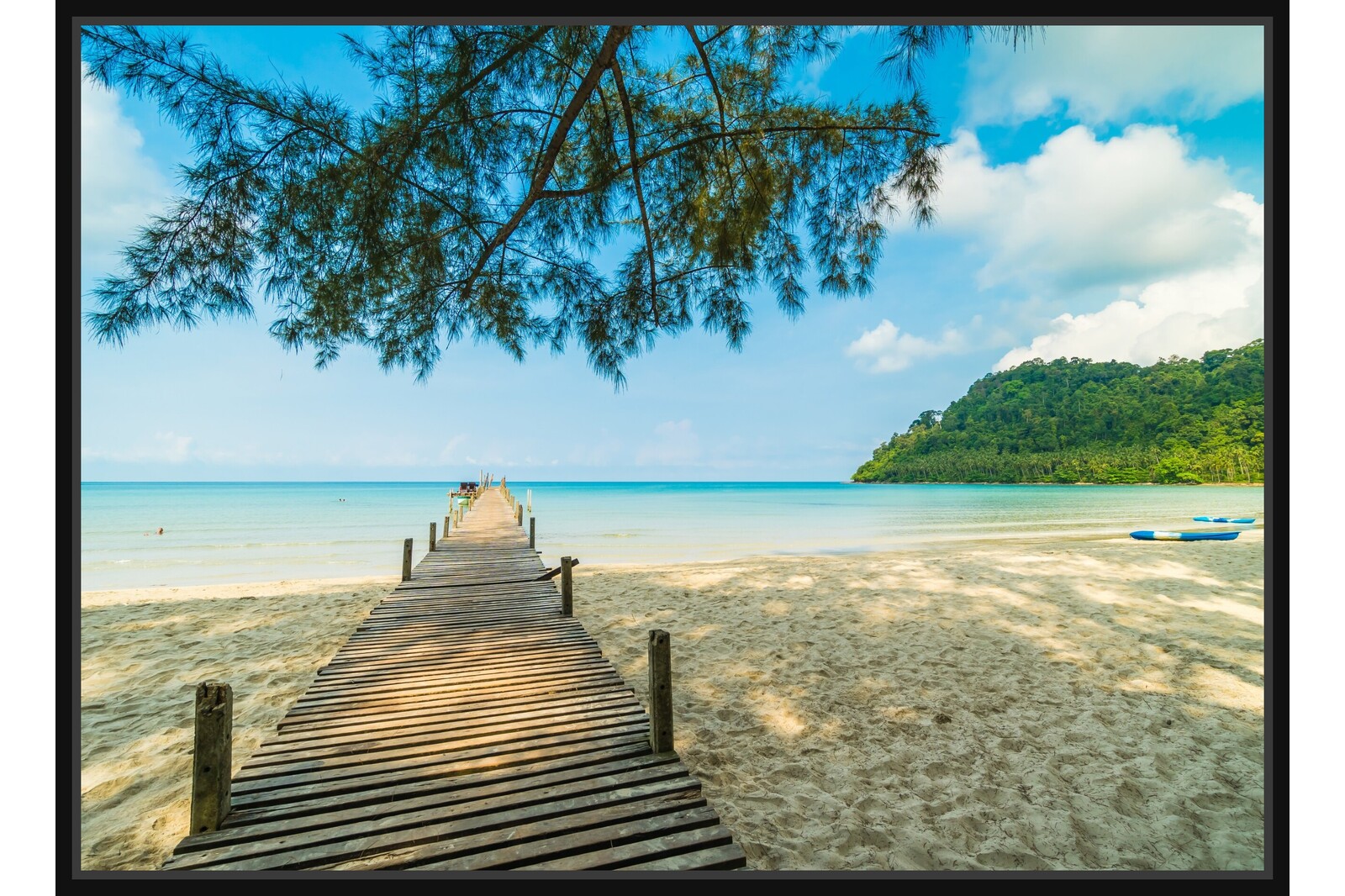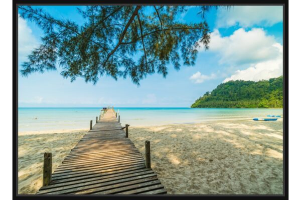 Изображение на дълъг дървен мост, който води към синьото спокойствие на морето. Кадърът символизира пътуване, свобода и хармония с природата.