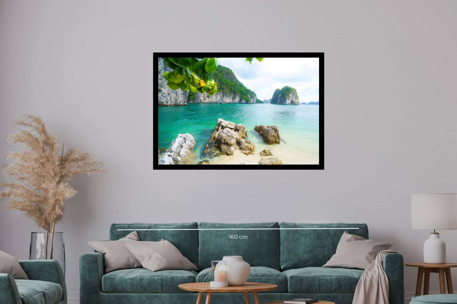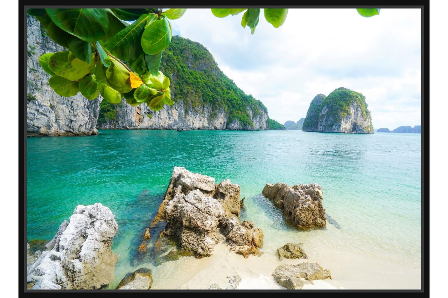 Ярка тропическа сцена с изумрудено зелено море и скалисти острови, покрити с буйна растителност. Кристалната вода и каменистият бряг създават усещане за приключение и екзотика.