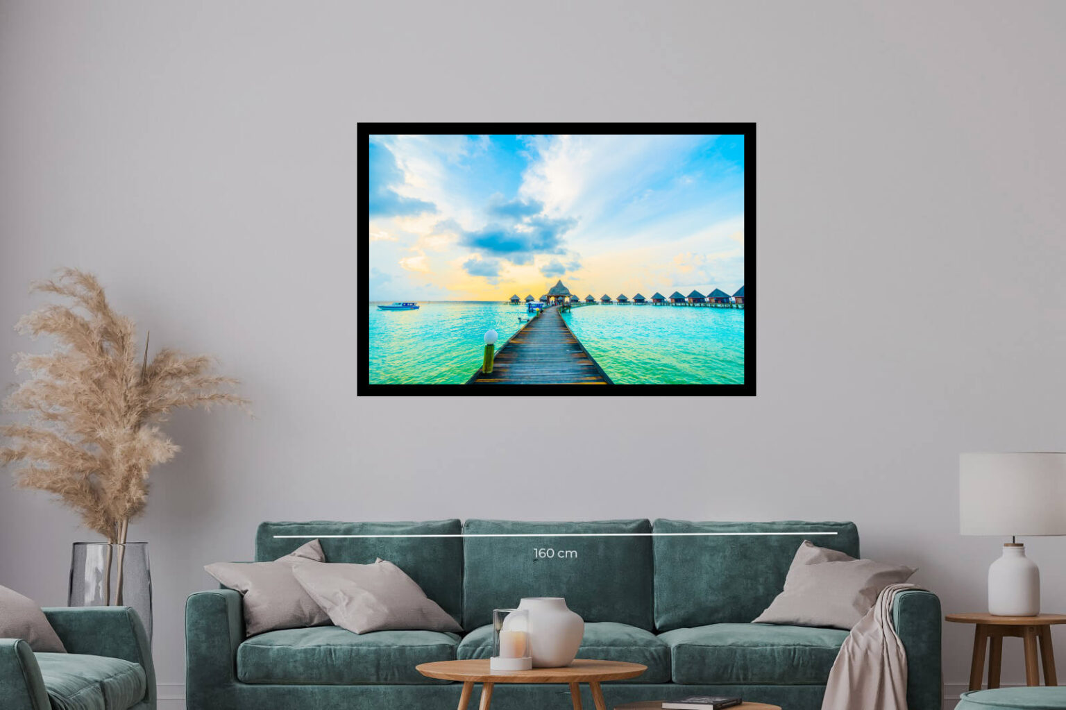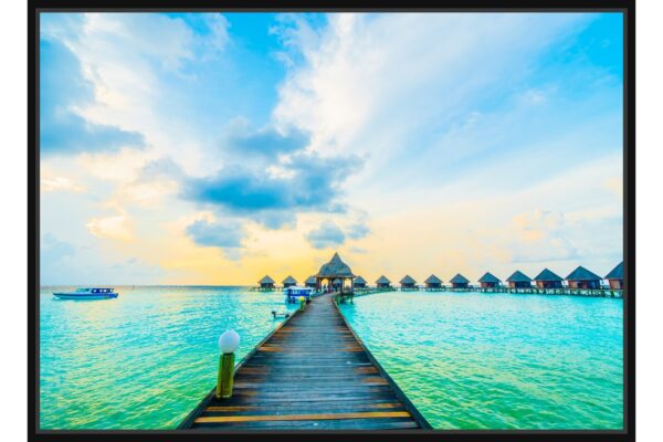 Дървен кей се простира над тюркоазените води на Малдивите, водещ към екзотични вили над водата.