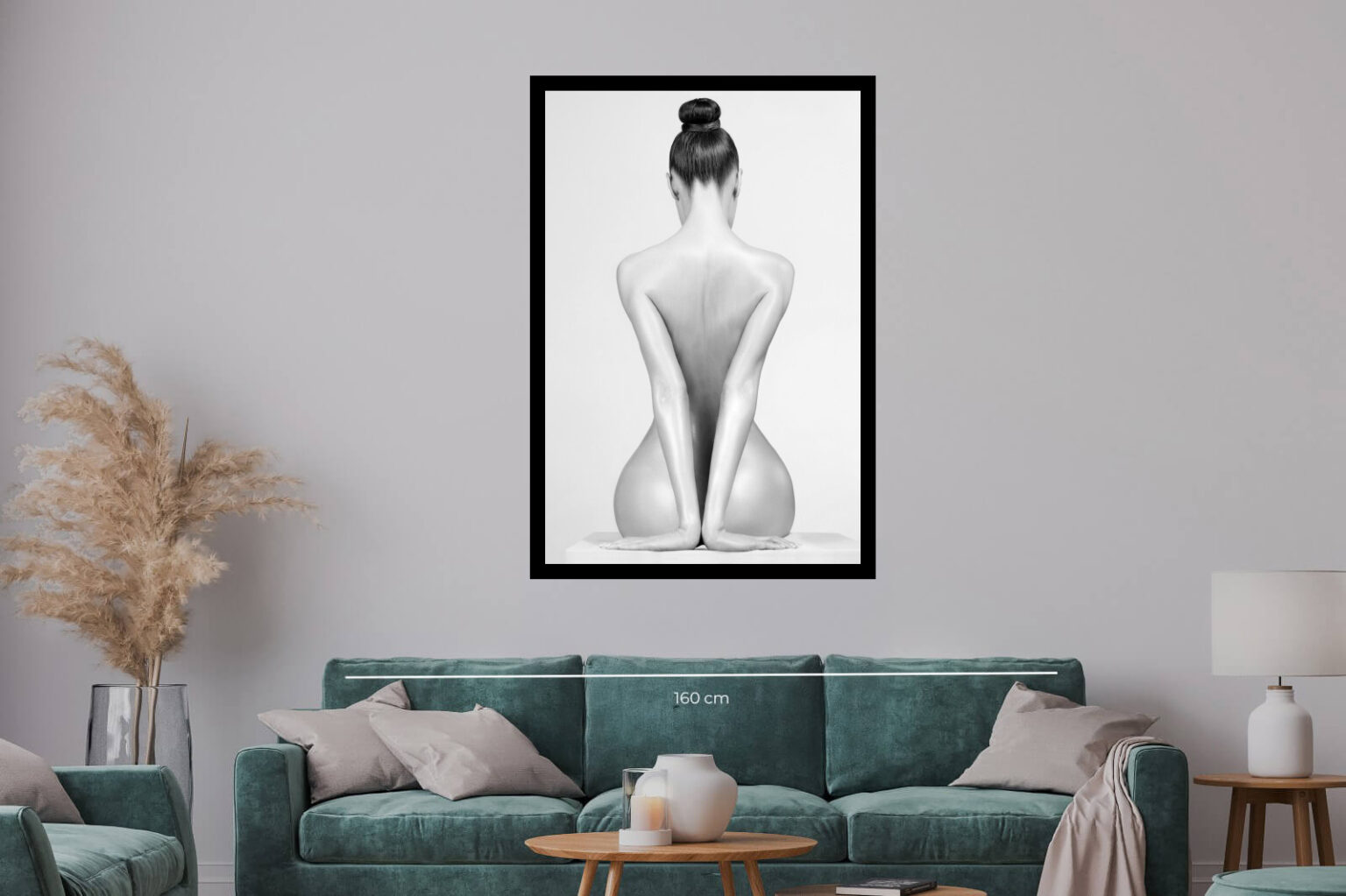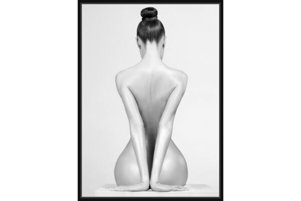 Художествена черно-бяла фотография, заснета отзад, показваща изящния силует на жена в минималистична композиция. Изображението подчертава хармонията на формата и светлината.