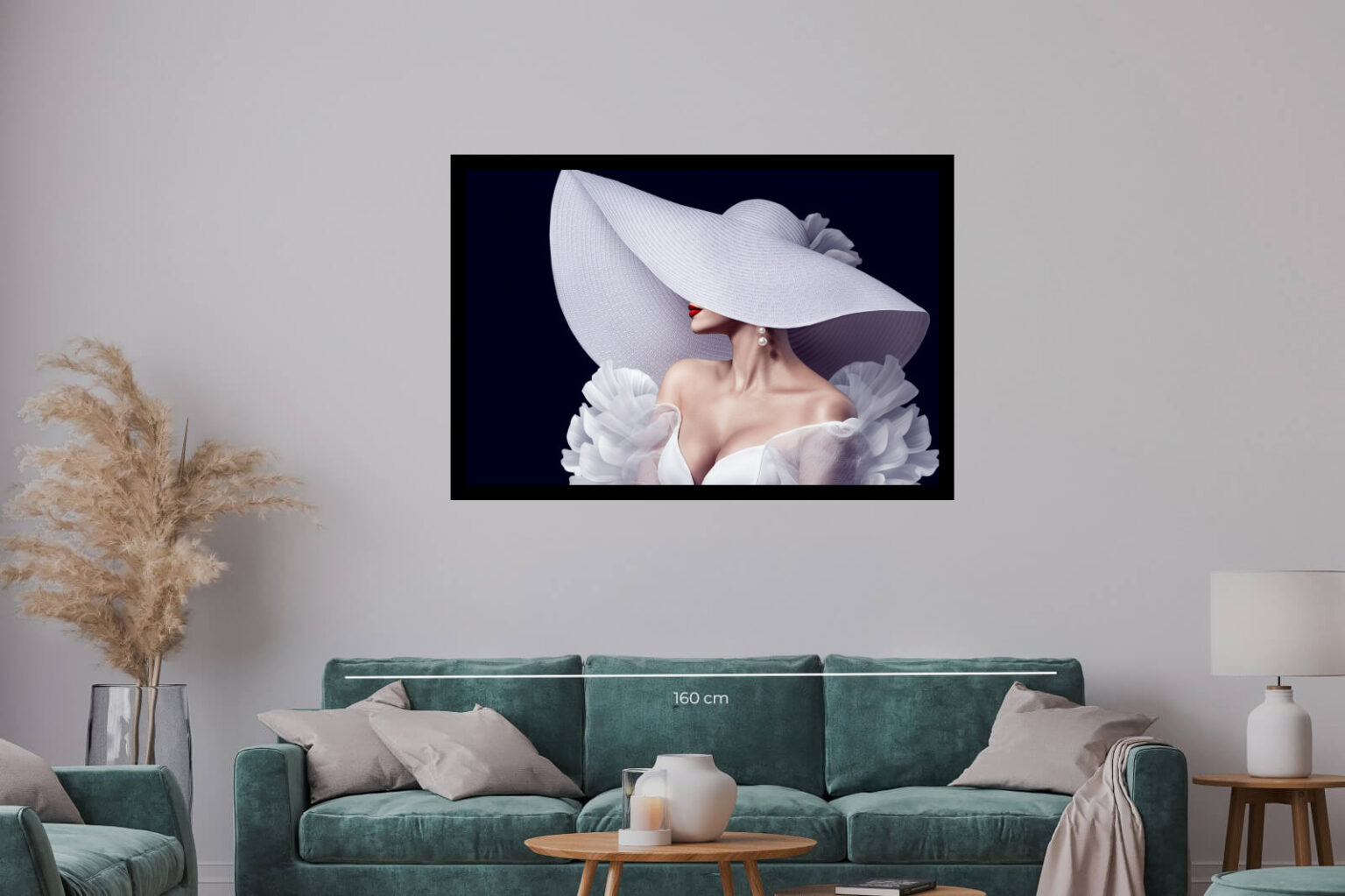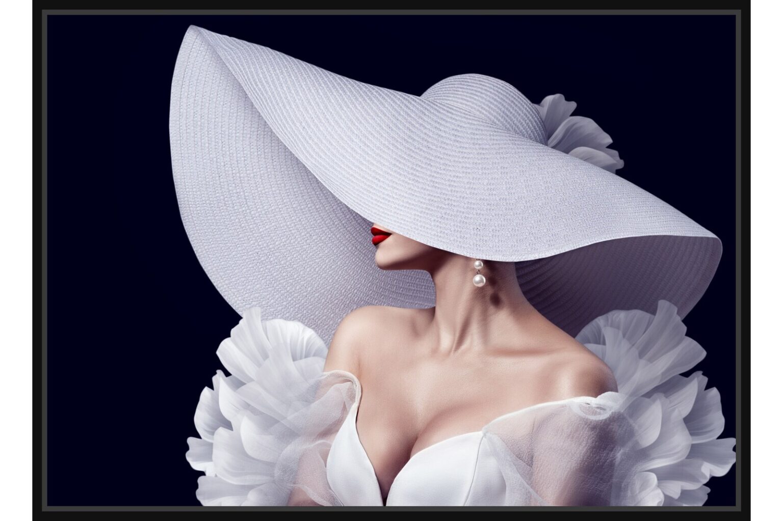Модерен портрет на жена с голяма бяла шапка и червено червило, подчертан от перлени обеци и ефирна бяла материя.