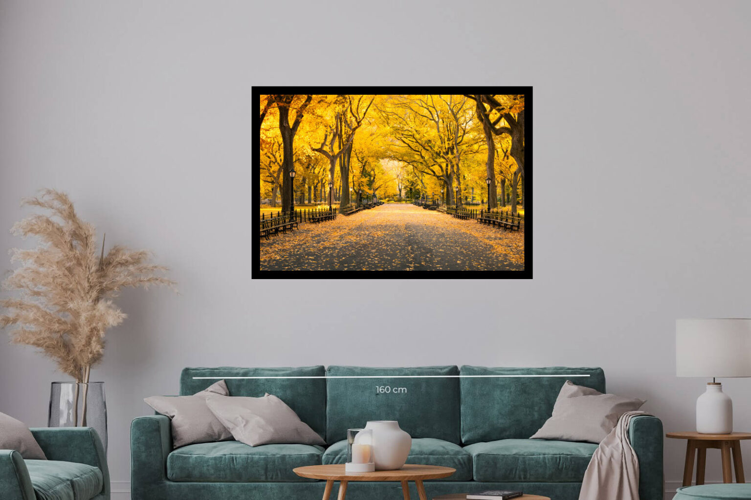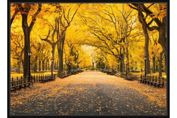 Панорамна снимка на Сентръл парк в Ню Йорк през есента. Дърветата са обагрени в златисти тонове, а пътеката, покрита с паднали листа, води зрителя в дълбочината на парка. Атмосферата е спокойна и носталгична.