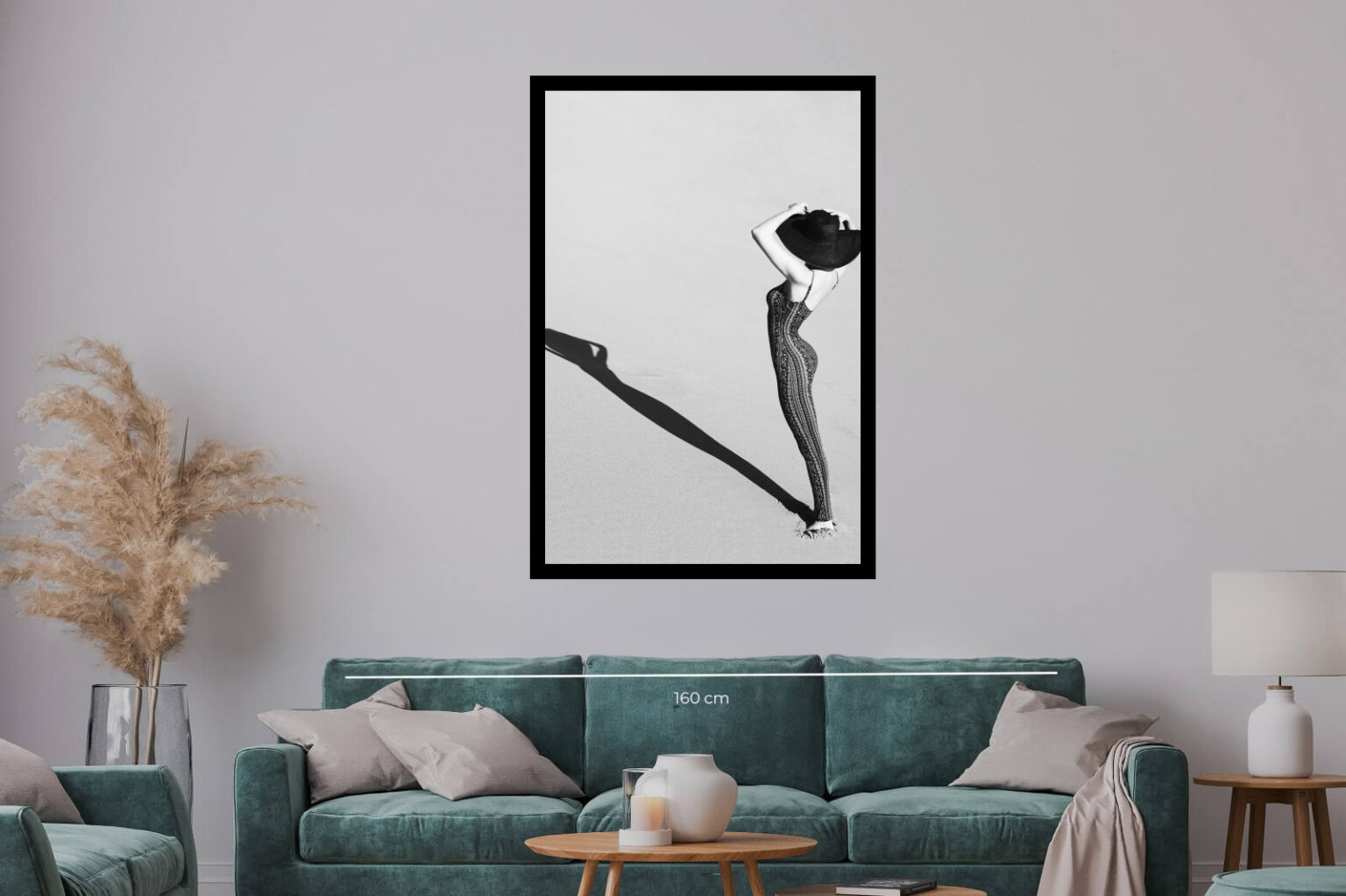 Черно-бяла артистична снимка на жена в дълъг гащеризон с шапка, която хвърля драматична сянка върху пустинния пейзаж. Контрастът между светлина и сянка създава дълбочина.