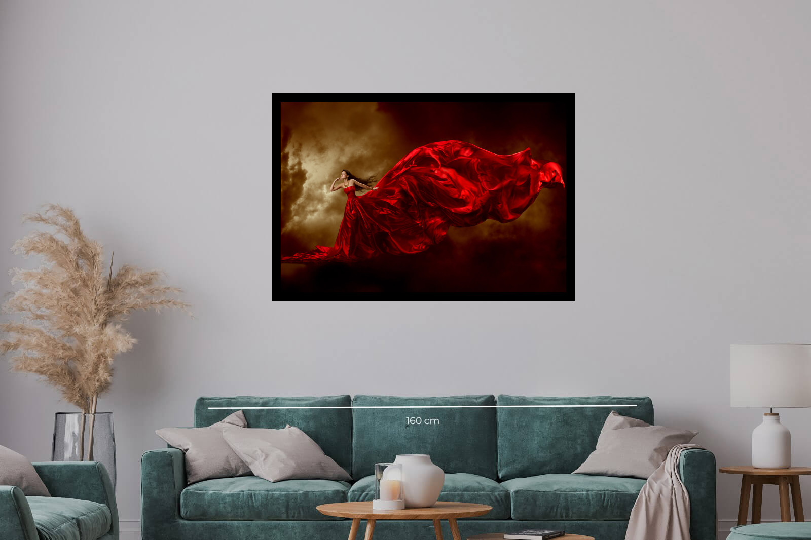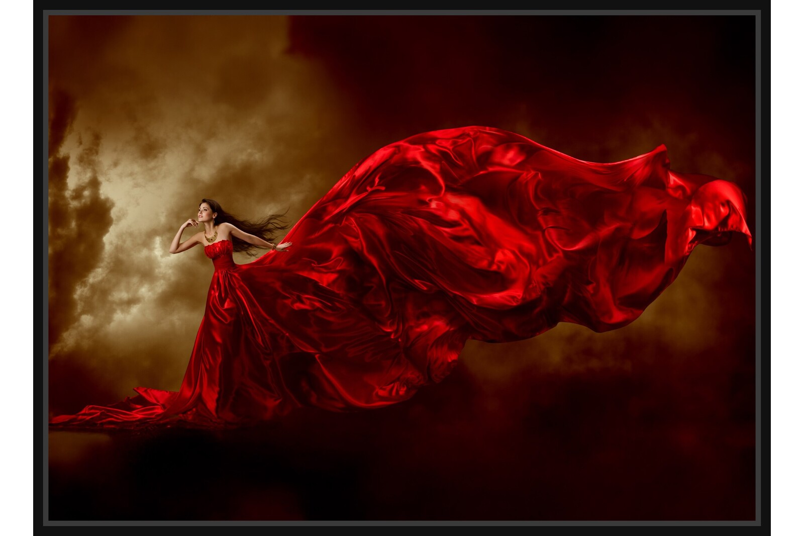 Художествена фотография на жена в ефектна червена рокля, развята от вятъра, на драматичен фон от облаци. Силно въздействащ и емоционален кадър.