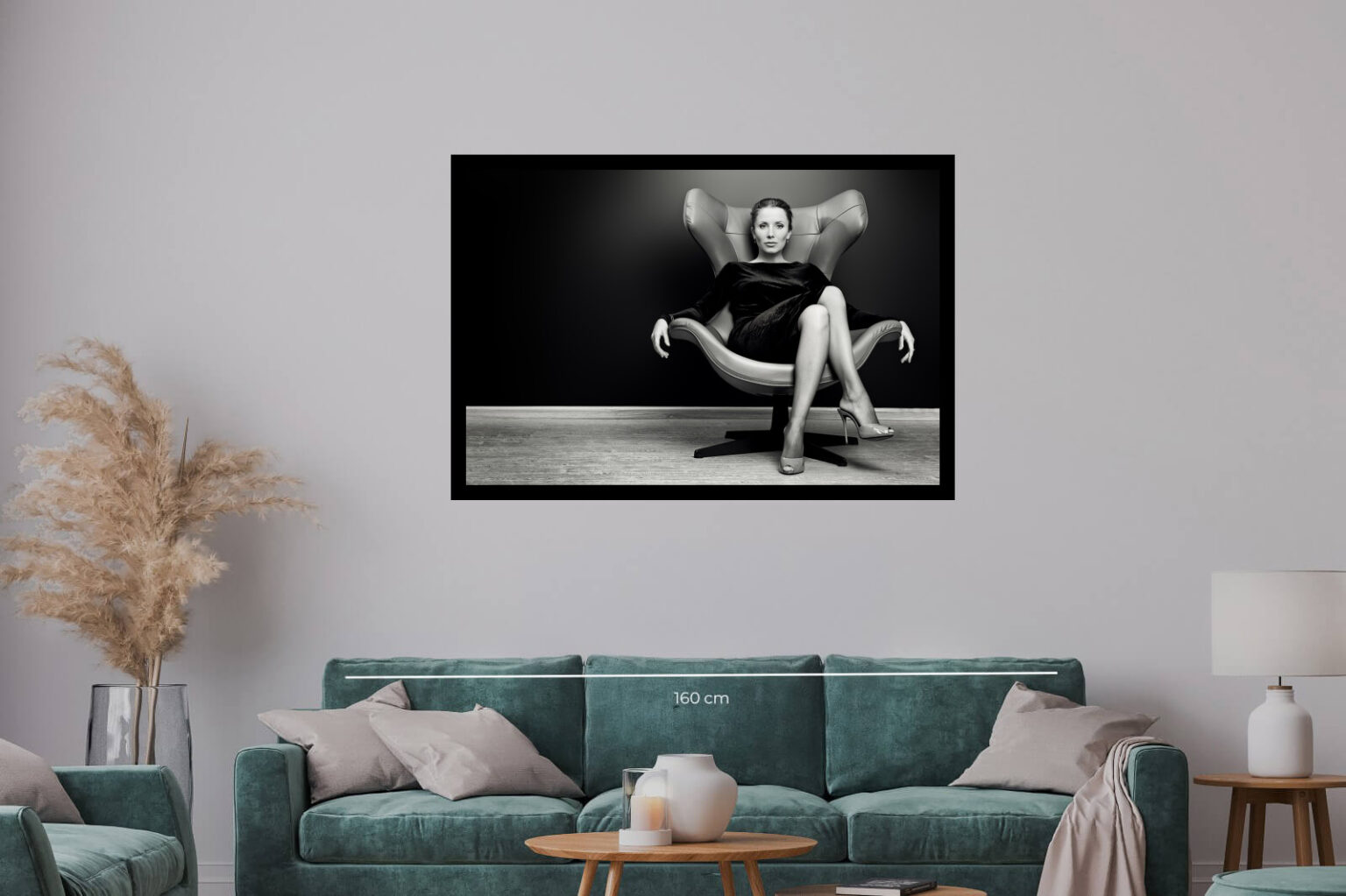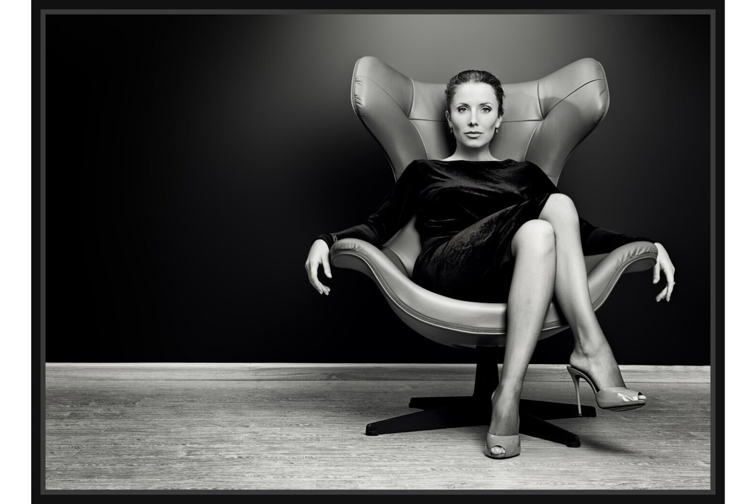 Изискан черно-бял портрет на жена в елегантна черна рокля, седнала на модерен дизайнерски стол. Силно стилизиран образ с усещане за класа.