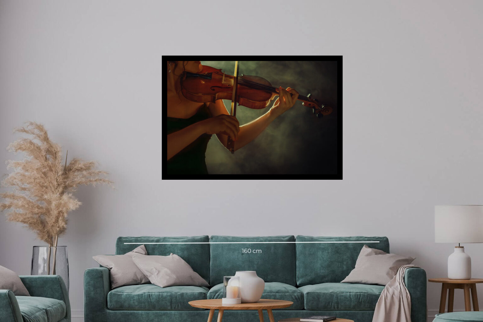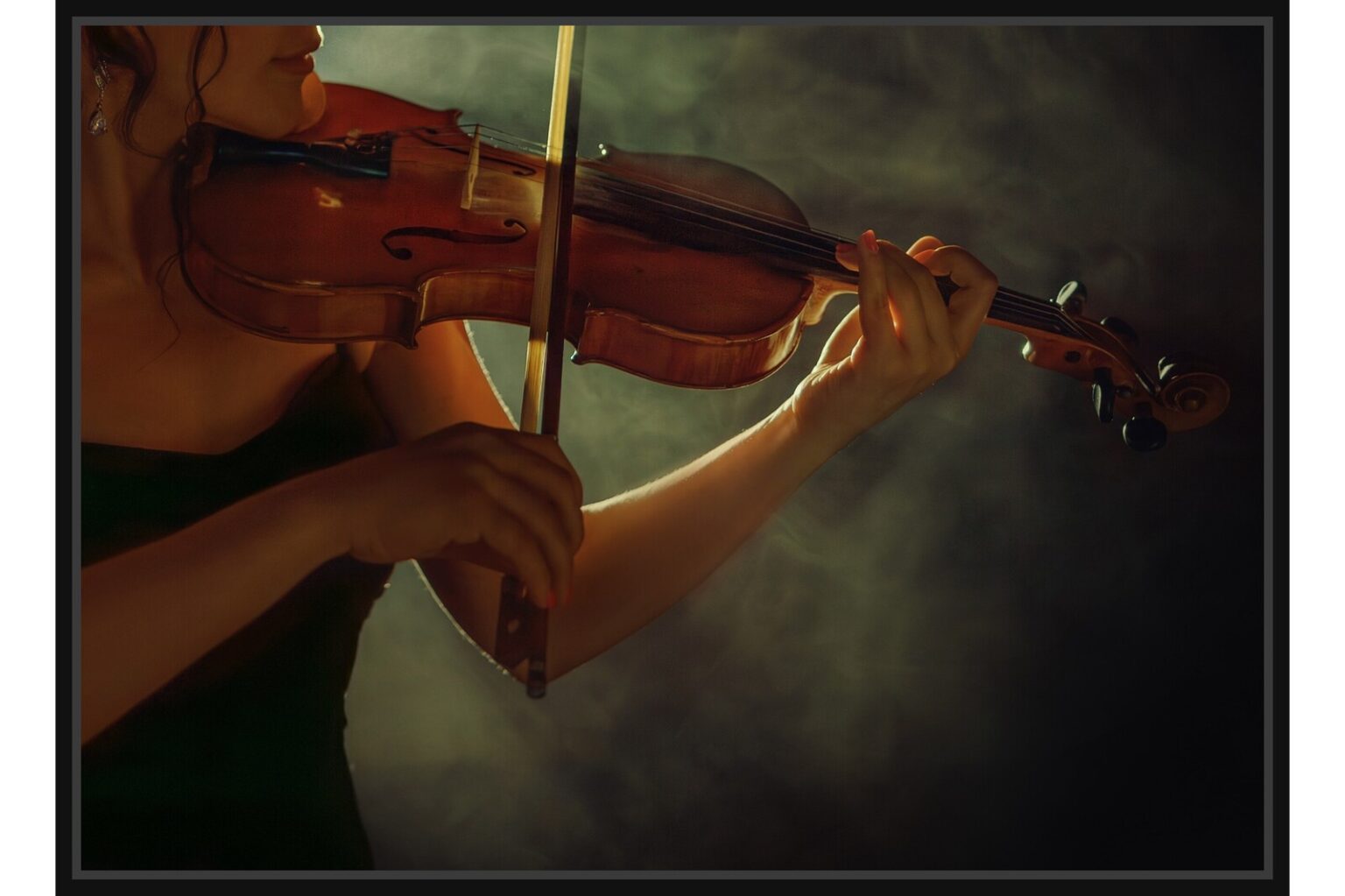 Емоционална фотография на жена, която свири на цигулка в атмосфера, обвита в мек пушек. Снимката носи усещане за страст, артистичност и музикална отдаденост.