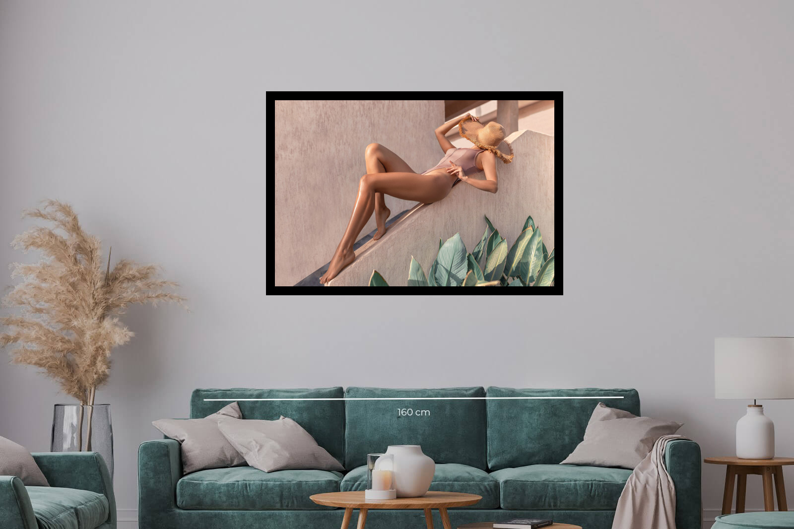 Модна фотография на жена с бански костюм и широка шапка, легнала до архитектурна стена с тропически растения. Снимката носи усещане за лукс и летен шик.