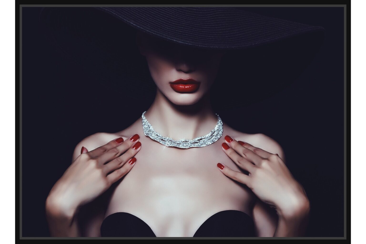 Фина и изискана фотография на жена с елегантна черна шапка и блестящо диамантено колие. Акцентът върху червеното червило и маникюра създава контраст с тъмния фон, подчертавайки луксозната атмосфера.