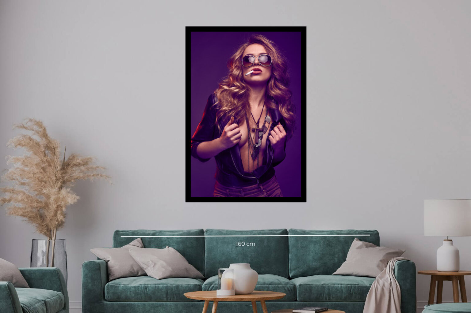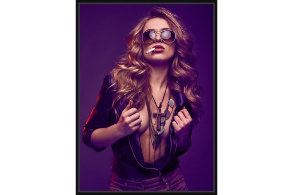 Модерен портрет на млада жена с кожено яке, цигара и очила. Атмосфера в пурпурни тонове, създаваща бунтарско настроение.