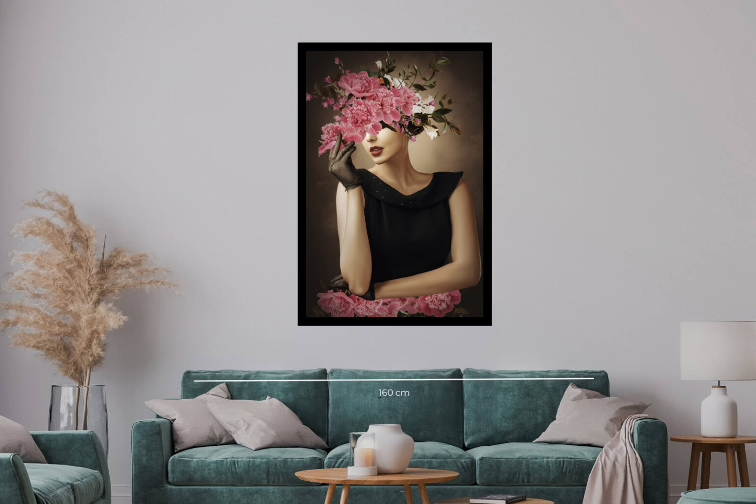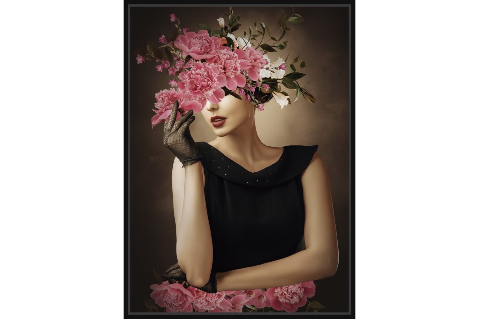 Художествен портрет на жена с черна рокля и ръкавици, чийто поглед е скрит от пищна аранжировка от розови божури и зелени листа.