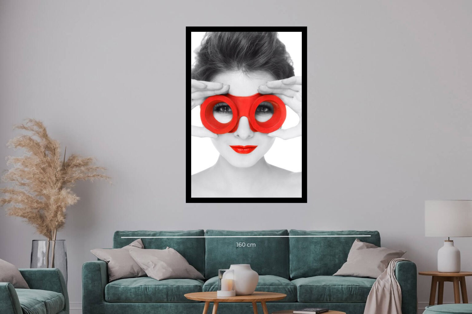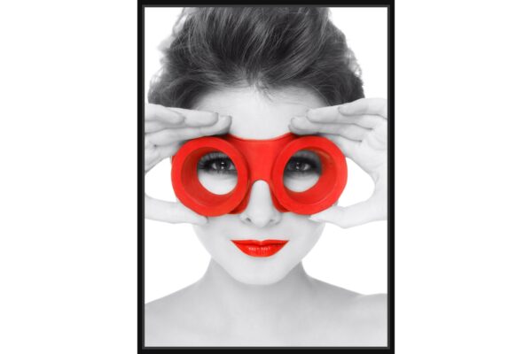 Черно-бял портрет на жена, която държи червени очила пред лицето си. Червените акценти и устните внасят игрив и артистичен характер.