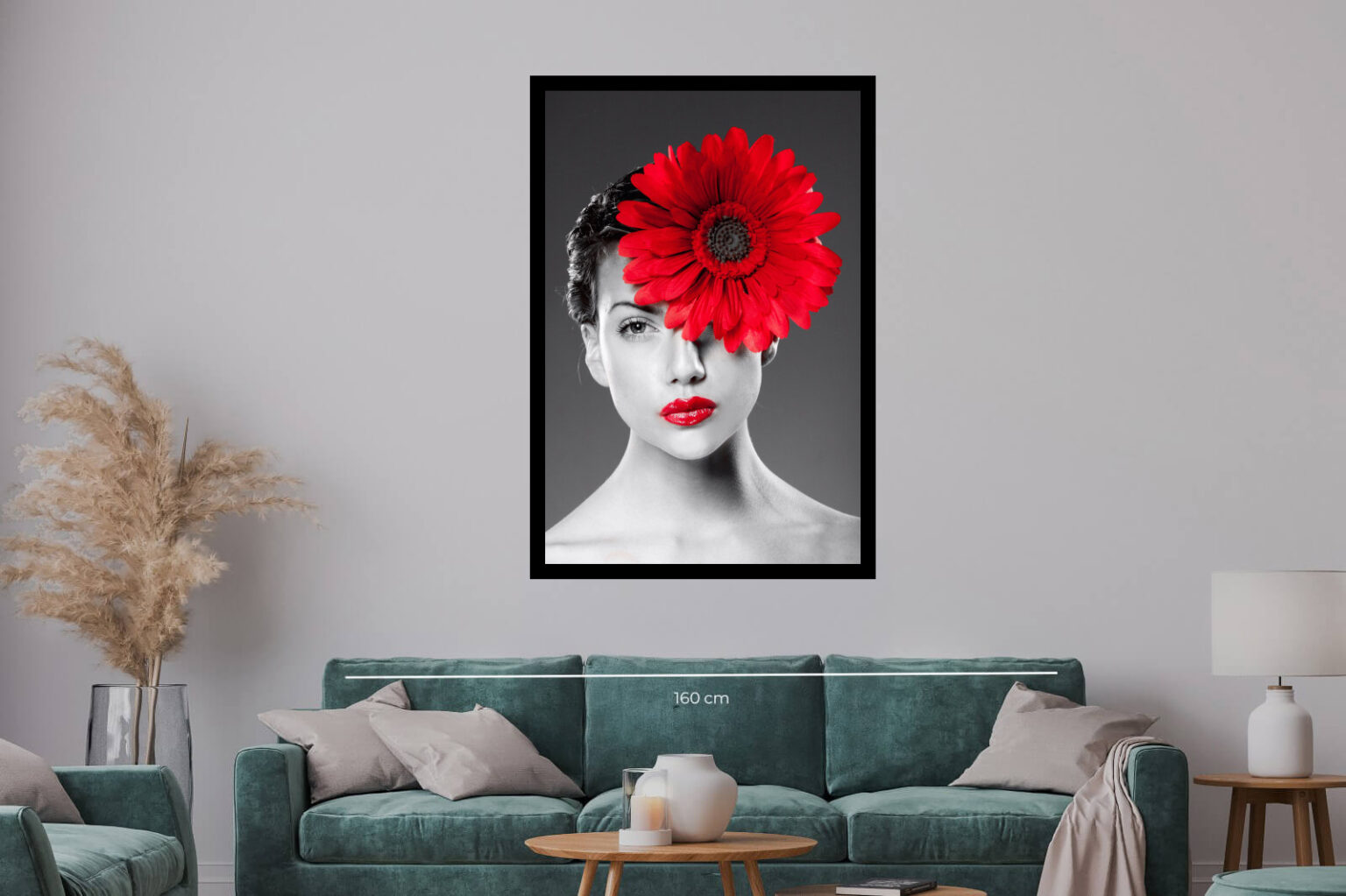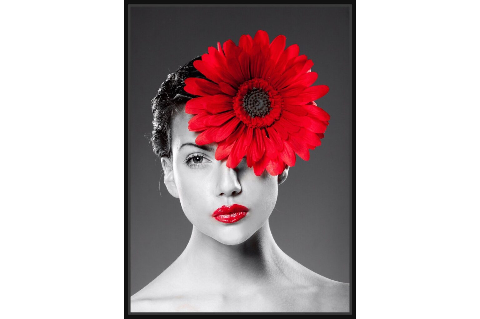 Художествен черно-бял портрет на жена с голямо червено цвете, покриващо едното й око. Контрастът между червеното и черното създава драматичен и стилен ефект.