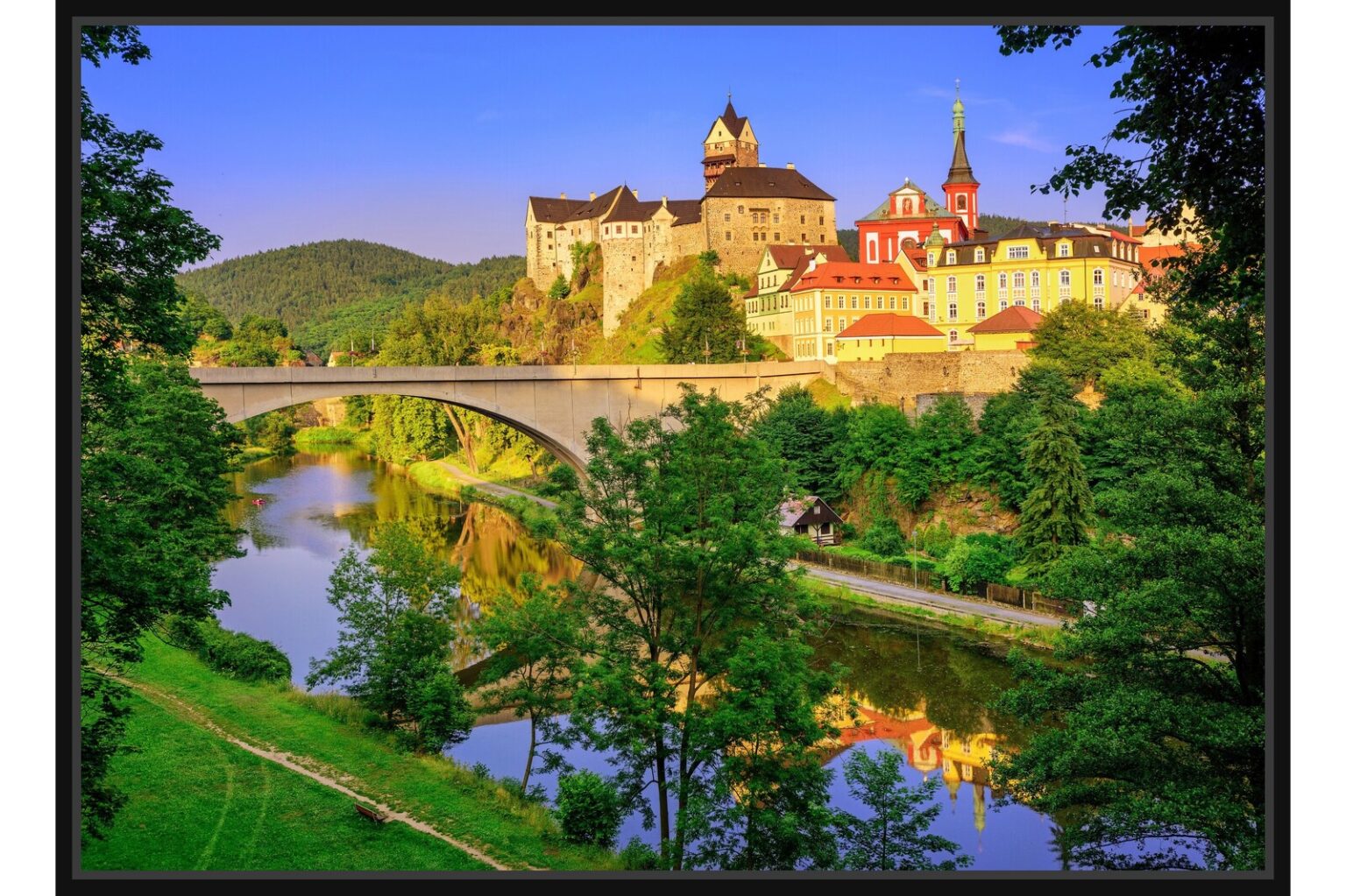Живописен европейски град с пъстър замък, църква и каменен мост, отразяващи се в реката. Снимката съчетава архитектурна красота и природна идилия.